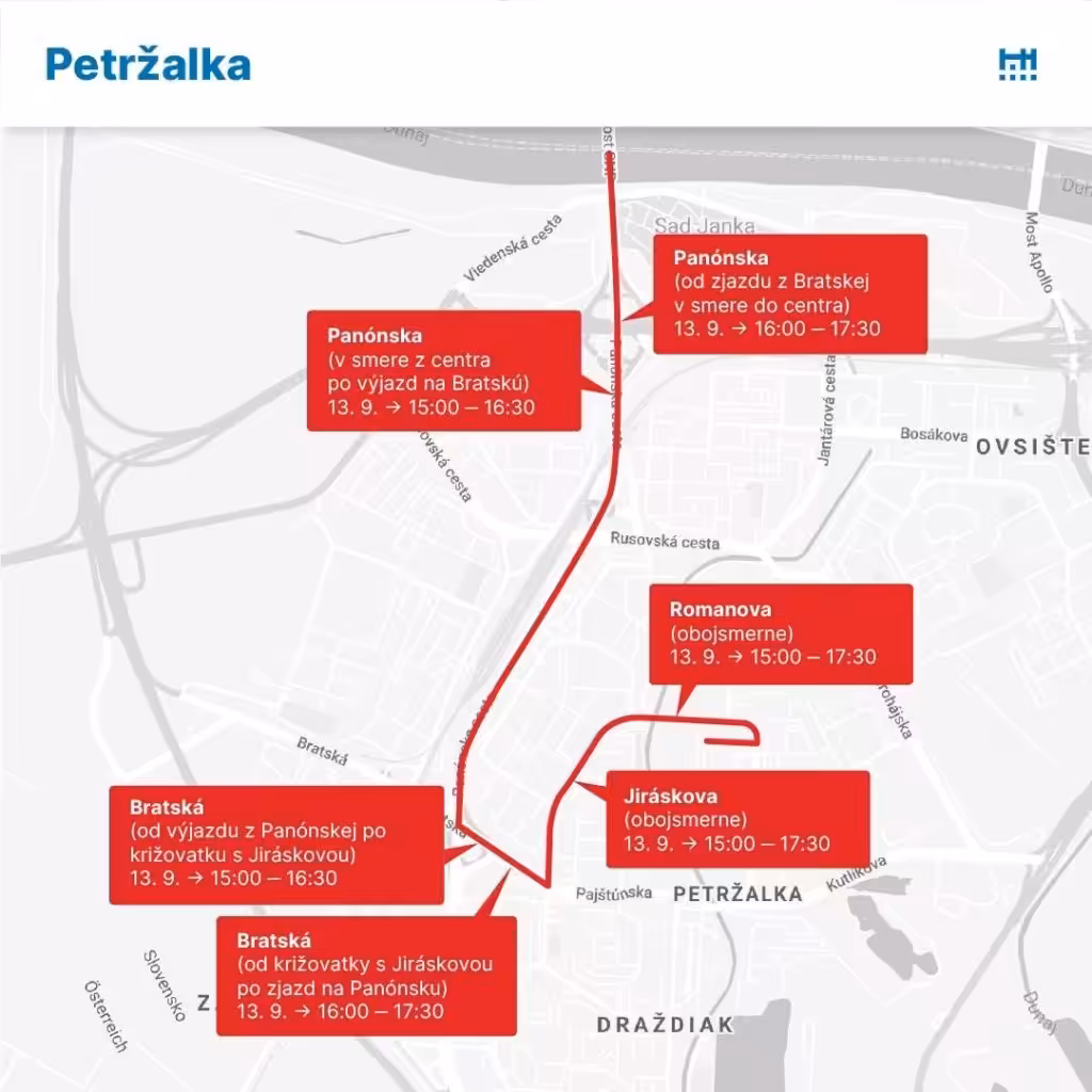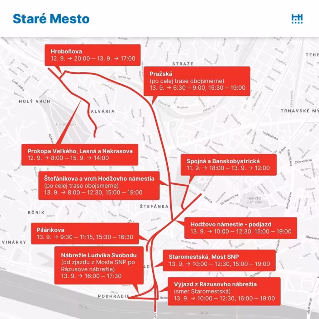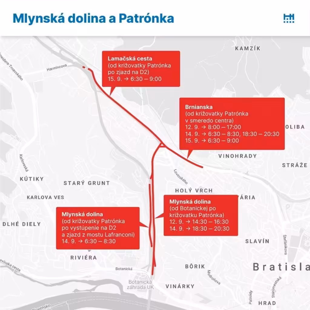 Na výraznejšie obmedzenia sa však treba pripraviť v pondelok 13.09.2021. Zmeny v doprave sú avizované už od ôsmej ráno. Môže tak prísť k väčším komplikáciám na ceste do práce či do školy. Počítať tak treba s výraznejšími zdržaniami než obvykle.