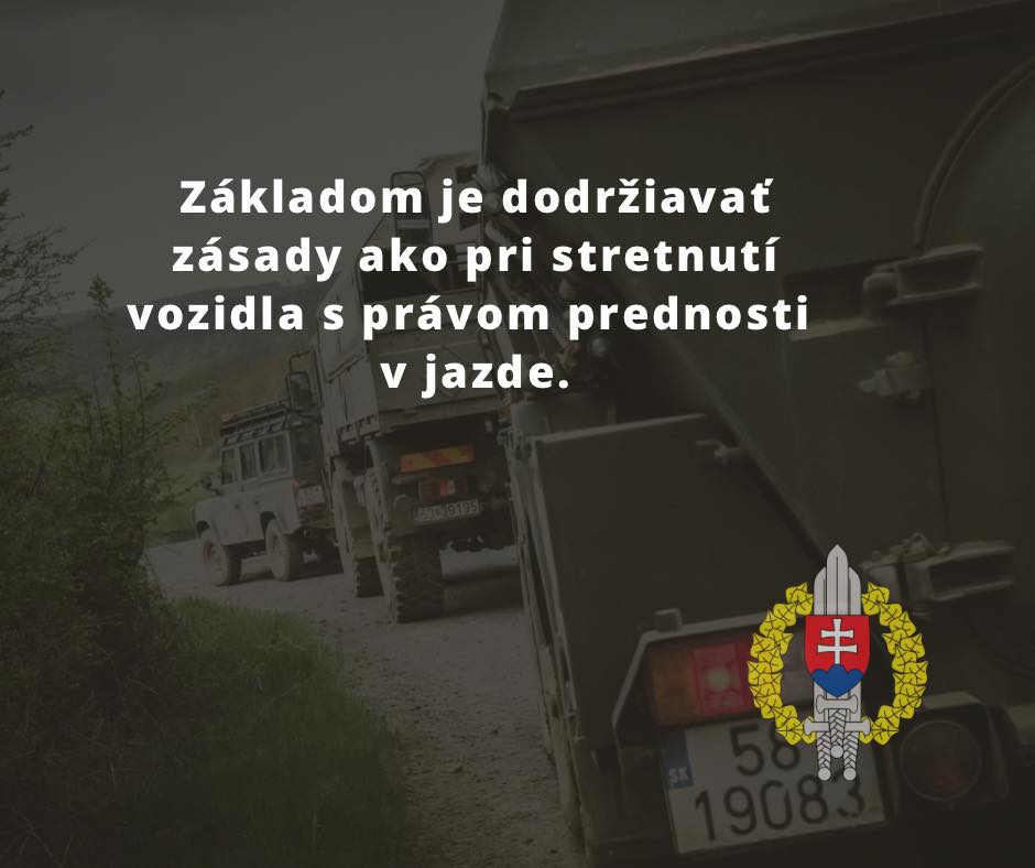 „Vojenské vozidlá môžu rozmermi zasahovať do vedľajších jazdných pruhov aj mimo cesty, mať obmedzené manévrovacie schopnosti, dlhšiu brzdnú dráhu či obmedzený výhľad z kabíny vodiča.“