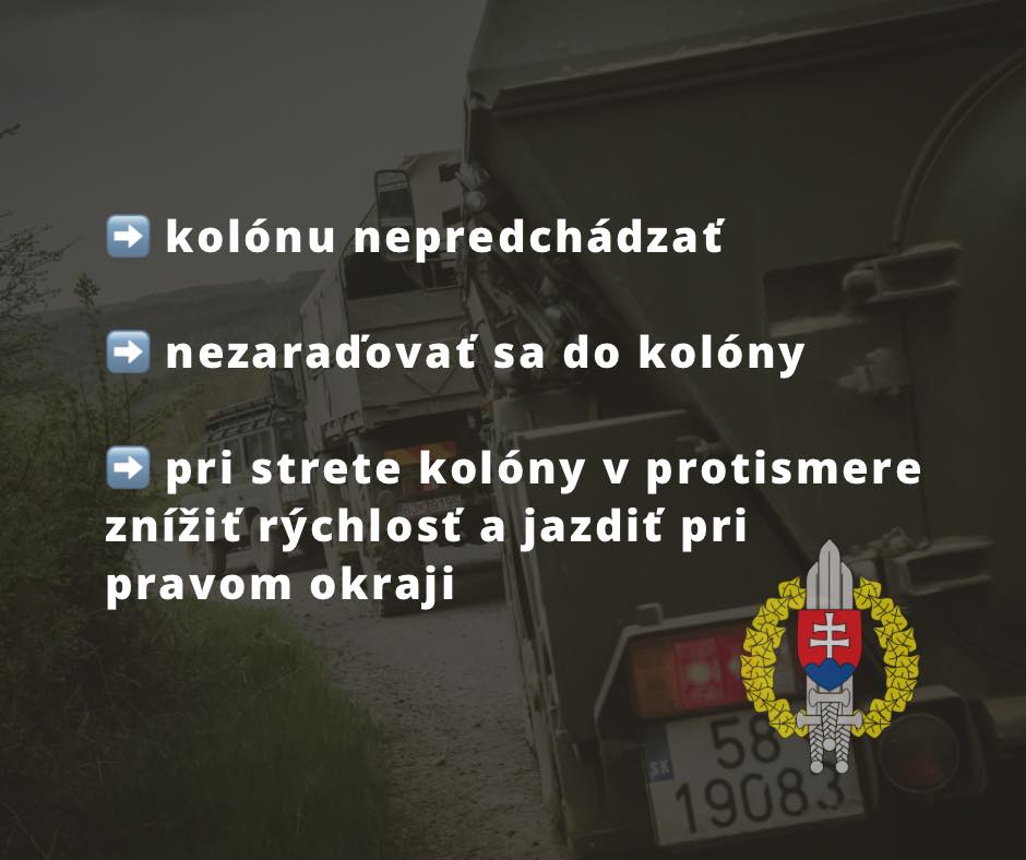 „Je nevyhnutné kolónu nepredchádzať (iba v prehľadných úsekoch), nezaraďovať sa do kolóny v žiadnom prípade (aj pri väčších rozstupoch vojenských vozidiel) a pri strete v protismere znížiť rýchlosť a jazdiť pri pravom okraji.“ Polícia upozorňuje aj na špecifické obmedzenia spojené s presunom techniky armády.