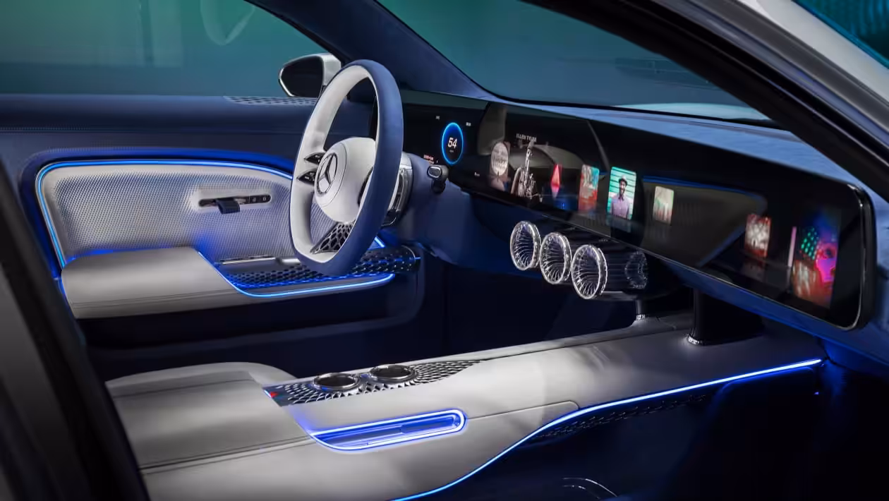 8k 47,5-palcový bezproblémový displej pokrýva celú šírku interiéru auta. Obsahuje osobného asistenta, 3D navigáciu v reálnom čase, ktorá využíva satelitné dáta. Tie možno priblížiť až do výšky 10 metrov pomocou konvenčných gest. Vision EQXX ponúka možnosť rýchleho dobíjania a dojazd na 300 km možno pridať za 15 minút, zatiaľ čo Mercedes zaručí novú technológiu batérií na 250 000 km alebo 10 rokov.