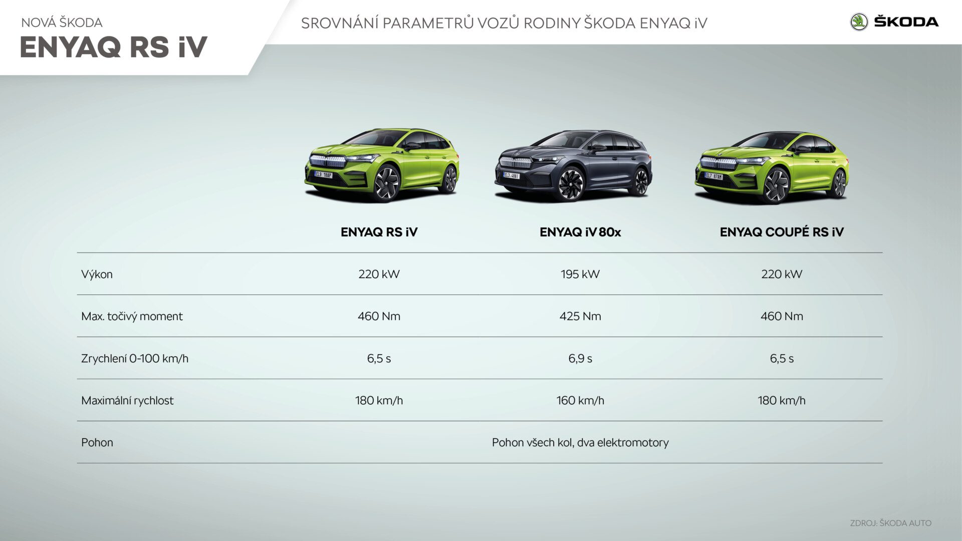 Tak ako sme už vyššie spomínali, praktickejšia verzia zdieľa rovnakú techniku so svojim súrodencom v karosérii coupé. O pohon sa teda starajú dva elektromotory, z toho každý na jednej náprave. Výkon je dokopy 220 kW (299 koní) a krútiaci moment 460 Nm. Vďaka tomuto výkonu zrýchľuje toto elektrické SUV na 100 km/h za 6,5 sekundy. Škoda Enyaq RS iV k tomu ponúka aj akumulátor s kapacitou 82 kWh. Podľa výrobcu a WLTP normy dokáže na jedno nabitie prejsť trasu dlhšiu než 500 kilometrov, čomu dopomáha aj výborný súčiniteľ odporu vzduchu, a to na úrovni len 0,265. Toto je naozaj slušný údaj, vzhľadom na nemalú čelnú plochu. Navyše, vďaka nabíjaciemu výkonu 135 kW dokážete nabiť Enyaq RS iV na rýchlonabíjacích staniciach z 10 na 80 % už za 36 minút.