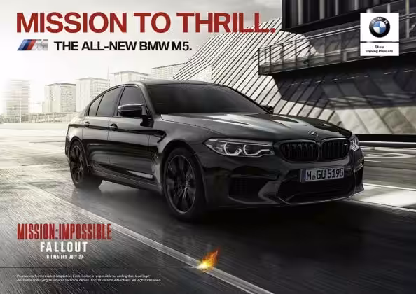 BMW bude exkluzívnym celosvetovým automobilovým partnerom ďalšieho pokračovania legendárnej filmovej série Mission: Impossible – Fallout, ktorý vstúpi 27. júla do kín. BMW ako partner tejto kultovej filmovej série pôsobí už od roku 2011, pričom v nadchádzajúcom filme BMW opäť predstaví celý rad vozidiel. Tentokrát sa v ňom objaví aj nové BMW M5.