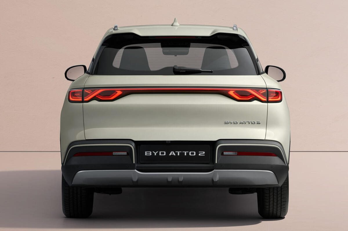 Dizajn si požičiava niektoré prvky od svojich súrodencov. Najmä plynulé LED svetlomety a čierny pruh so strieborným lemovaním vpredu, plus svetelná lišta po celej šírke vzadu, ktorá spája prepletené usporiadanie zadných svetiel v tvare “čínskeho uzla” a sú navrhnuté tak, aby vyzerali ako číslo osem a symbol Mobius Infinity, ktorý znamená šťastie. Medzi ďalšie detaily na BYD Atto 2 patrí dizajn plávajúcej strechy, množstvo čiernych oplastových povrchov, zapustené kľučky dverí a vzduchové clony na oboch stranách predného nárazníka, ktoré vedú vzduch pozdĺž auta.