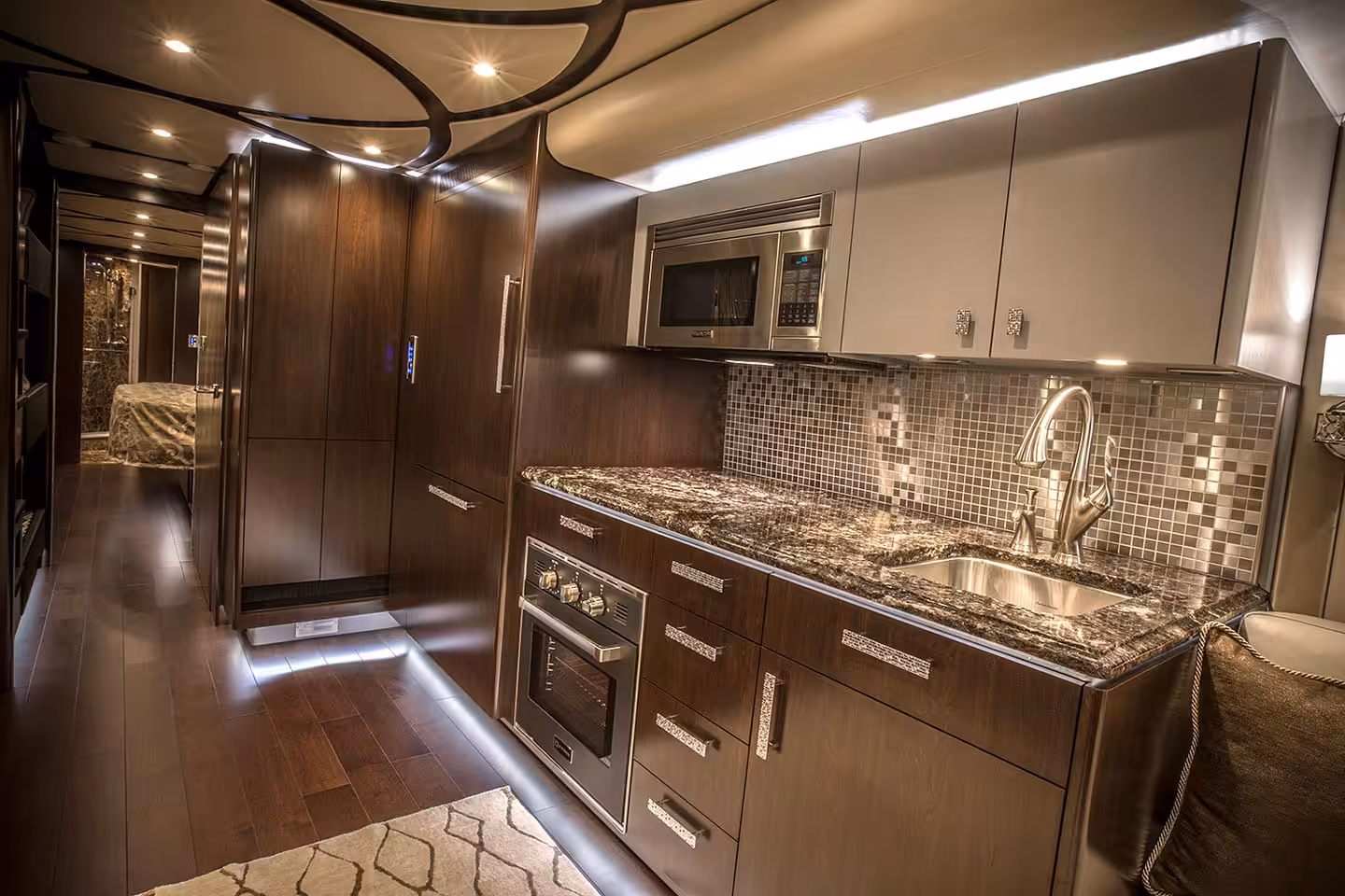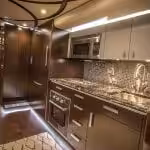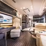 Featherlite Coaches stavajú obytné vozidlá z autobusov Prevost, do ktorých potom doplnia, čo je nutné. Každého prekvapí a doženie ku kúpe dizajn z pravej kože, vybrané druhy dreva a mramor.