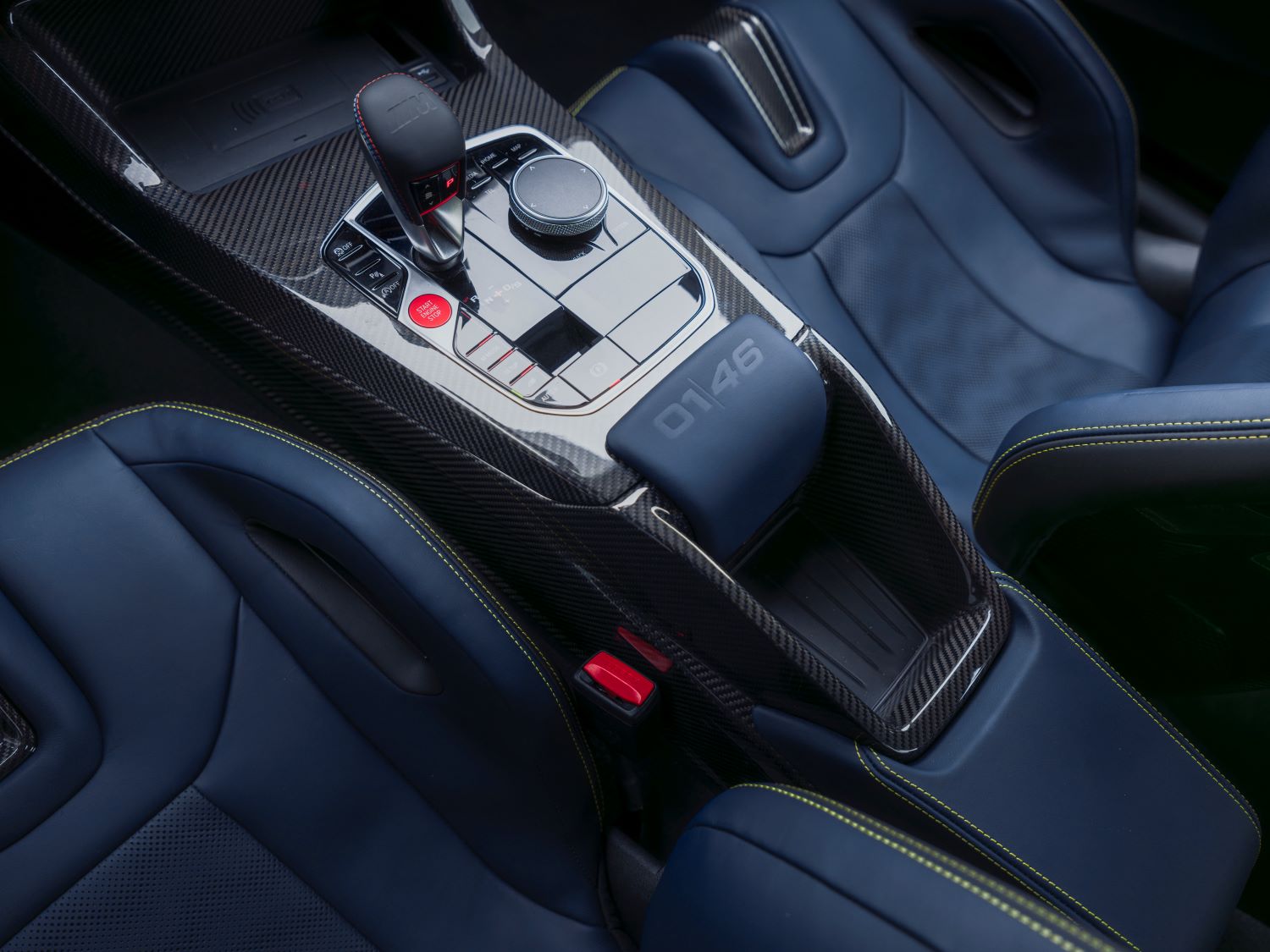 Žlté akcenty pokračujú aj v interiéri, ktorý je prevažne tmavo modrý. Sedadlá M Carbon sú dodávané s koženým čalúnením Merino vo farebnej kombinácii Black/Night Blue. Opierky hlavy, podobne ako prahové lišty, majú výrazné žlté logo VR46. Aj volant s trojramenným dizajnom a vencom s plochým dnom je dodávaný so žltým kontrastným prešívaním a žltou stredovou značkou. Na stredovej konzole z uhlíkových vlákien všetkých exemplárov Edition VR46 je odznak s označením „1/46“, ktorý označuje každé z limitovaných vozidiel.