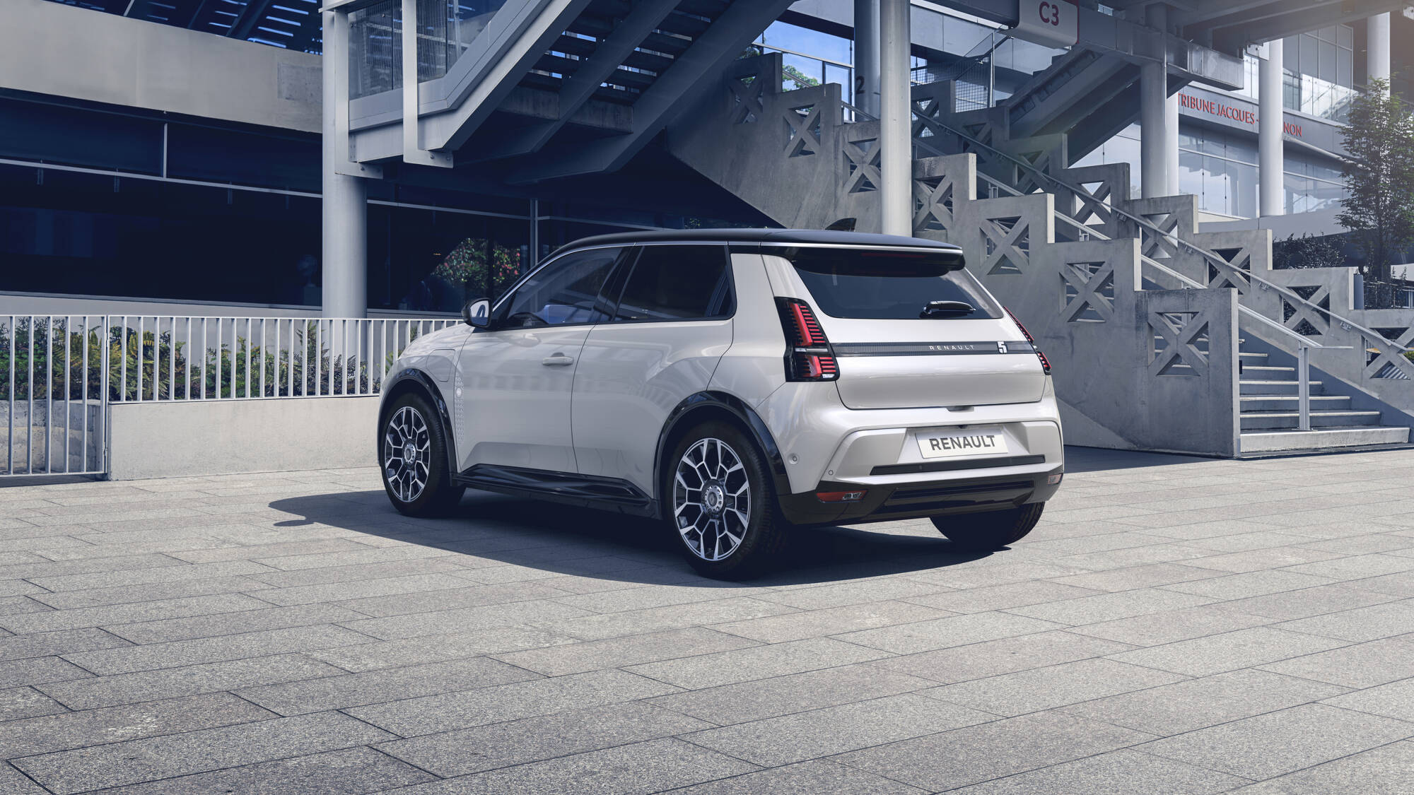 K dispozícii sú pre Renault 5 Roland-Garros štyri farby karosérie: biela nacré, modrá nocturne, čierná étoilé a matná sivá schist satin. Tieto farby ladia s matne chrómovanou líniou strechy a špeciálne navrhnutými 18-palcovými čiernymi hliníkovými kolesami Electro s nábojmi v odtieni Satin Schist Grey. Ďalšie špecifické detaily ešte viac zvýrazňujú exteriérový vzhľad vozidla. Na spodnej strane predných dverí sa nachádza kríž svätého Andreja so symbolom Roland-Garros inšpirovaný architektúrou štadióna Roland-Garros.