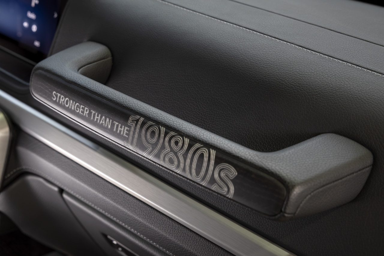 Aj interiér špeciálnej edície nadväzuje na estetiku osemdesiatych rokov. Sedadlá sú čalúnené čierno-bielou kožou Nappa s kontrastným prešívaním, zatiaľ čo prístrojová doska kombinuje tmavé tóny s vintage detailmi. Výrazným prvkom je emblém „Stronger Than the 1980s“ umiestnený na palubnej doske a podlahových rohožiach.
