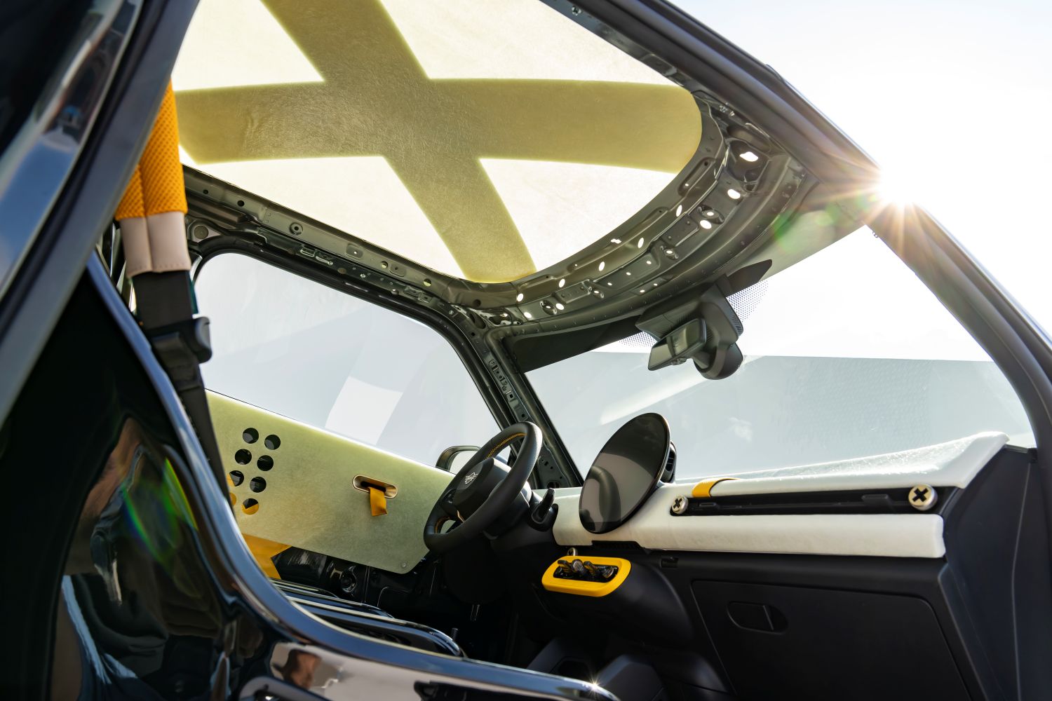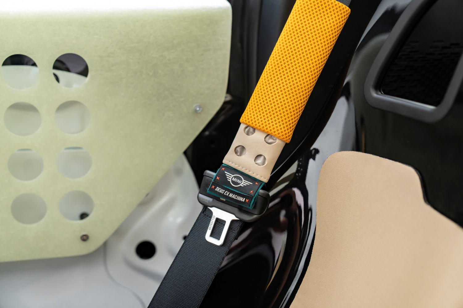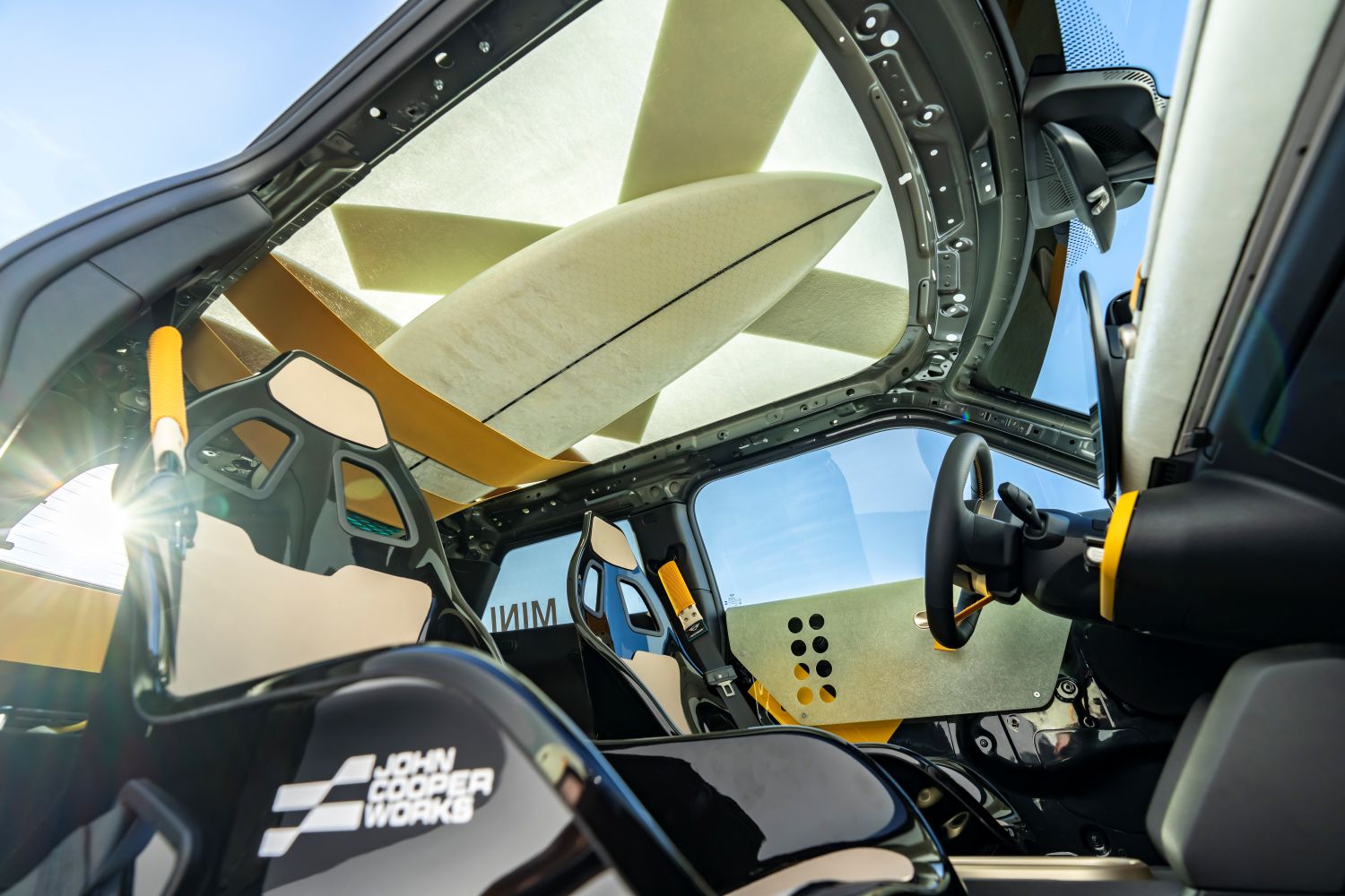 Napínacie popruhy na streche odkazujú na známy rituál upevňovania surfovej dosky po surfovaní a zároveň zostávajú charakteristickým dizajnovým detailom novej rodiny MINI, ktorý zdobí palubnú dosku a aj lúč volantu. Na mieru vyrobené prvky zo sklenených vlákien na streche, prednej i zadnej časti a aj v interiéri vytvárajú meniacu sa hru svetla. Sú priehľadné, pevné a reagujú na denné svetlo a prostredie, zatiaľ čo samotný prístrojový panel je priamo inšpirovaný konštrukciou surfovacej dosky.