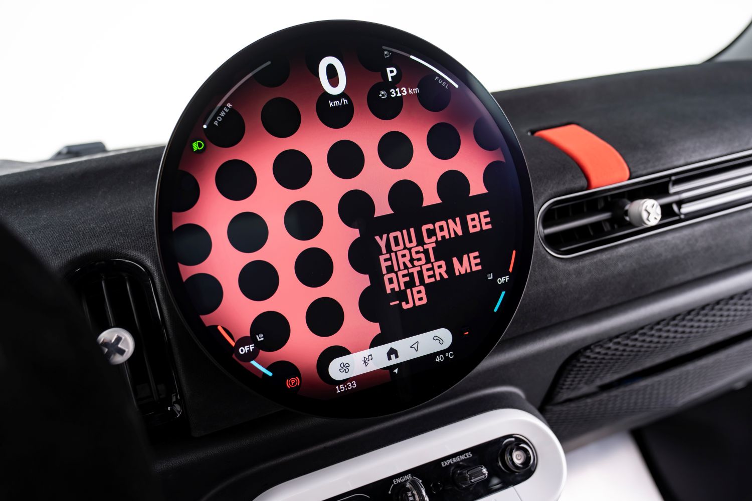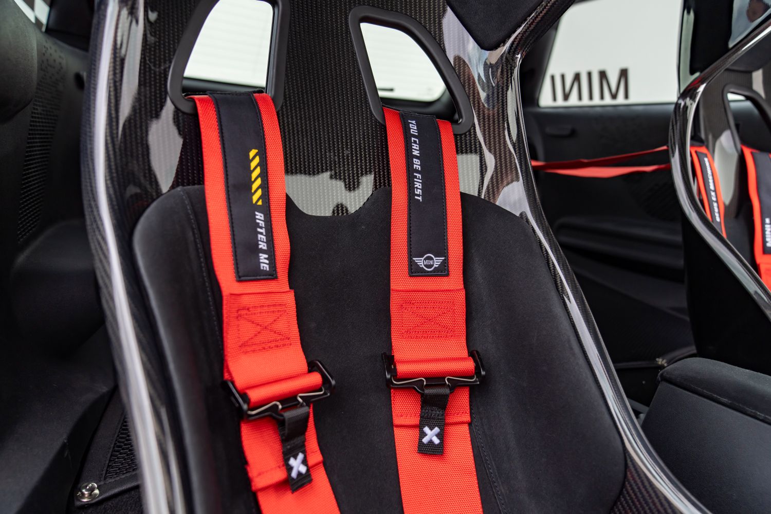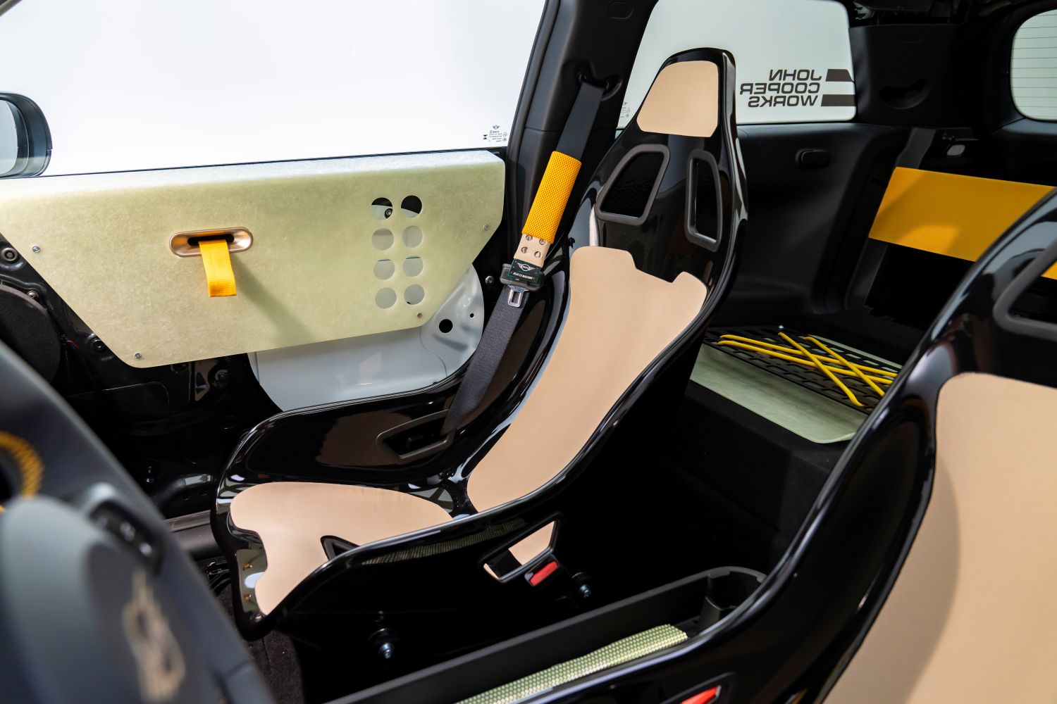 V interiéri showcaru JCW dominuje červená, biela a čierna farebná paleta – strohá, účelová a nezameniteľná pre John Cooper Works. Päťbodové bezpečnostné pásy precízne obopínajú telo vodiča. Úspora hmotnosti je zakomponovaná do každého povrchu, od odľahčených panelov dverí až po voskovaný textilný prístrojový panel. Nad hlavou sa nachádza odhalený bezpečnostný rám.