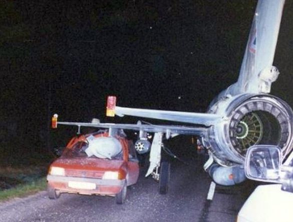 Policajti okamžite varovali ostatné jednotky, ktoré sprevádzali konvoj s lietadlom. Vozidlá sa stiahli ku krajnici, aby uvoľnili cestu a zabránili čelnej zrážke. O niekoľko sekúnd neskôr sa z tmy vyrútilo osobné auto, ktoré v plnej rýchlosti narazilo do prídavnej palivovej nádrže upevnenej na ľavom krídle MIGu. Nádrž prerazila čelné sklo, prešla cez vodičovo sedadlo a vyrazila zadné okno.