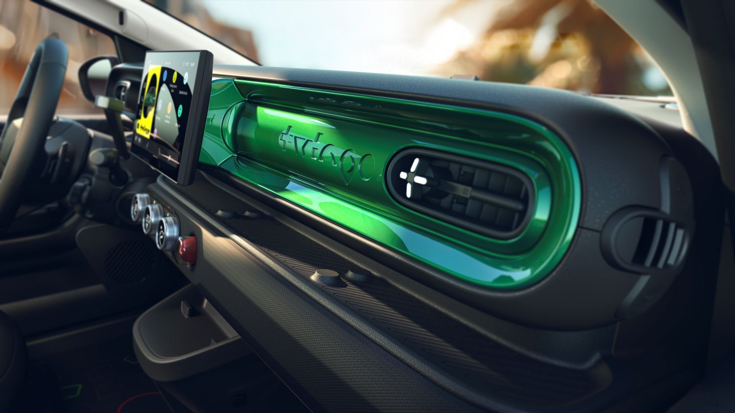 Rovnako ako prvá generácia, aj nové Twingo má veselý interiér s podlhovastými prvkami, ktoré sú farebne zladené s karosériou. To platí napríklad pre bočné lišty na predných dverách i lištu palubnej dosky smerujúcu k spolujazdcovi. Bočná lišta na predných dverách nie je samostatnou súčasťou, ale je súčasťou karosérie lakovanej súčasne s karosériou. Aby bola táto vlastnosť panelov dverí zdôraznená, umiestnili dizajnéri kľučku dverí na koniec lakťovej opierky, tesne pod prsty cestujúcich.