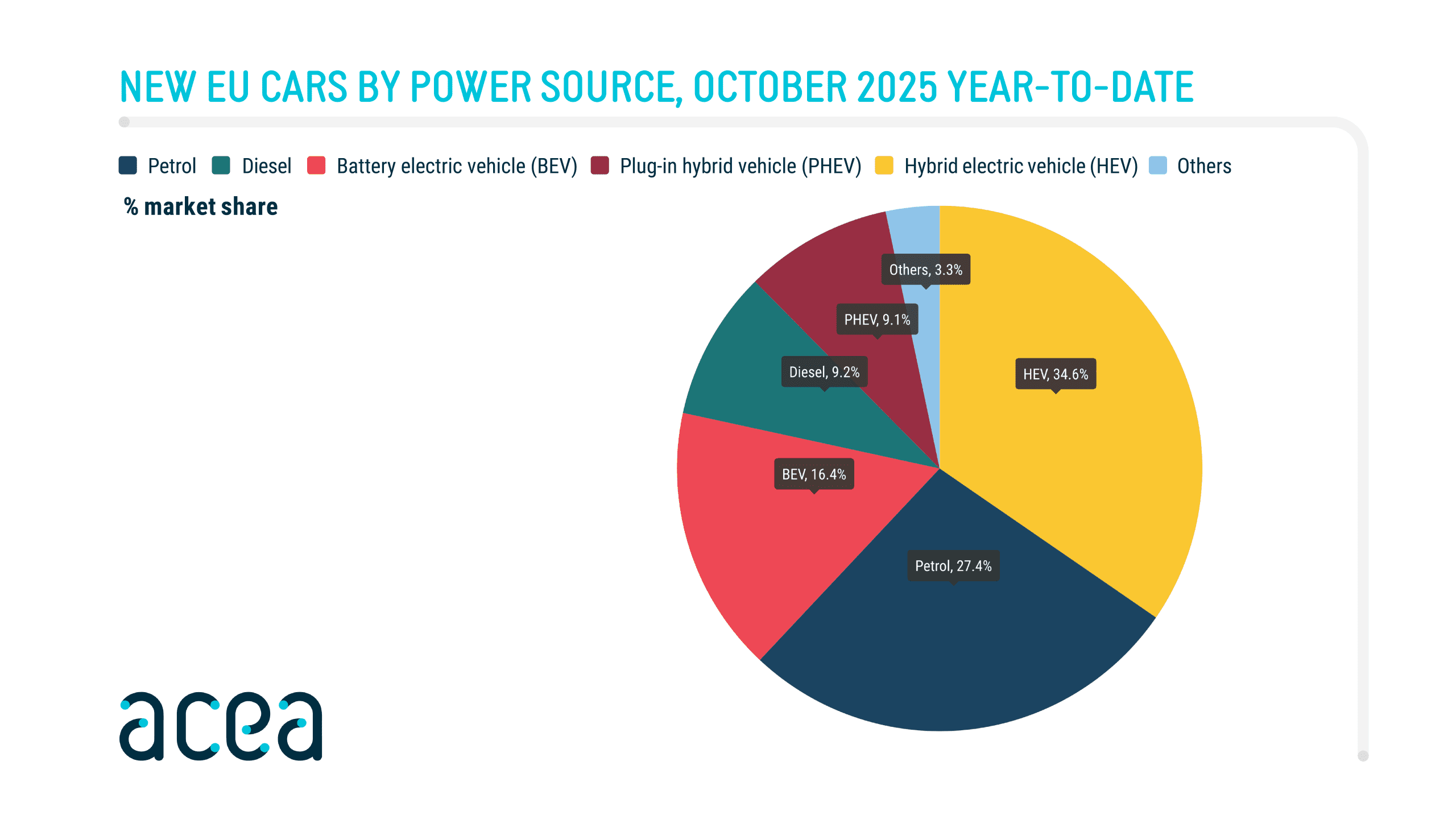 Tie si počas prvých desiatich mesiacov tohto roka udržali 9,4-percentný podiel na trhu. Do konca októbra predstavovali dieselové vozidlá len 8 percent z celkového predaja nových áut v 27 krajinách EÚ, Islande, Lichtenštajnsku, Nórsku, Švajčiarsku (EFTA) a Spojenom kráľovstve. Už koncom druhého štvrťroka sa PHEV dostali v predajoch pred konvenčný naftový pohon a rozdiel sa pravdepodobne bude už len zväčšovať.