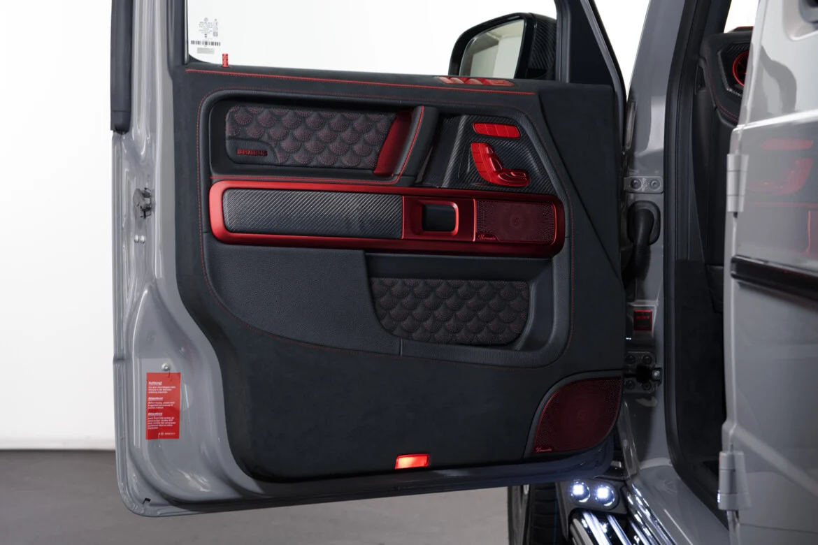 Odkryté prvky z uhlíkových vlákien aplikované na palubnú dosku, stredovú konzolu a dverové panely definujú architektúru kokpitu, zatiaľ čo uhlíkové pedálové podložky a zladená opierka nohy ešte viac pridávajú exkluzívne výkonnostné akcenty. Karbónový volant je vybavený novo vyvinutými radiacimi páčkami s exponovaným karbónom. Integrované LED indikátory v reálnom čase zobrazujú postup otáčok motora a vizuálne označujú optimálny bod radenia prostredníctvom farebnej sekvencie od zelenej po žltú a červenú. Všetky štyri dvere kabíny, ako aj dvere batožinového priestoru, majú osvetlené vstupné panely z uhlíkových vlákien s integrovaným osvetlením, synchronizované s ambientným osvetlením vozidla. Na zlepšenie prístupu k zadným sedadlám je vybavený špeciálnymi pántmi Easy-Entry, ktoré predlžujú uhol otvorenia na 90 stupňov. Ako posledný exkluzívny vrchol zážitku je každý Brabus 900 Rocket Edition dodávaný s ručne vyrobeným krytom na kľúče a taškou Weekender, vyrobenými z rovnakej vysoko kvalitnej kože a individuálne prispôsobenými interiérovým špecifikáciám majiteľa.
