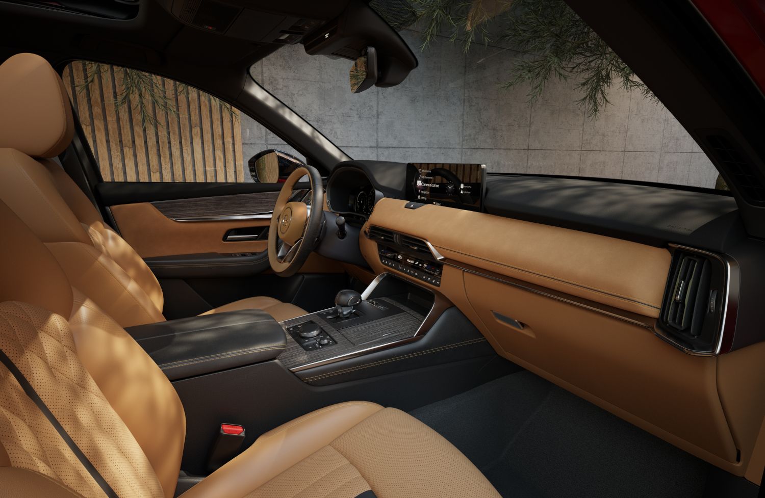 Aktualizovaná Mazda CX-60 ponúka vylepšenú nastaviteľnosť sedadla, širšiu a dlhšiu stredovú lakťovú opierku a premiestnené ovládacie prvky pre väčšie pohodlie. Prepracované lakťové opierky a rukoväte na dverách zvyšujú oporu a pohodlie vďaka ergonomickému usporiadaniu.