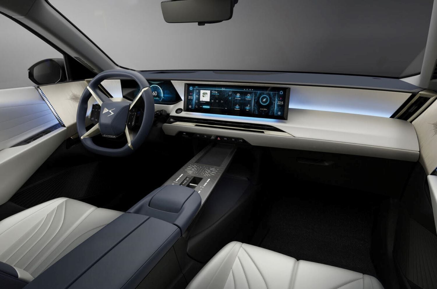 Vo vnútri DS N°7 pokračuje v tradícii francúzskeho luxusu, ale s digitálnym twistom. Centrálnym bodom je nová generácia infotainmentu, ktorý beží na zakrivenej OLED obrazovke. Tradičné fyzické ovládače boli nahradené haptickými plochami a pokročilým hlasovým asistentom s integráciou umelej inteligencie (ChatGPT), ktorá dokáže predvídať potreby vodiča.