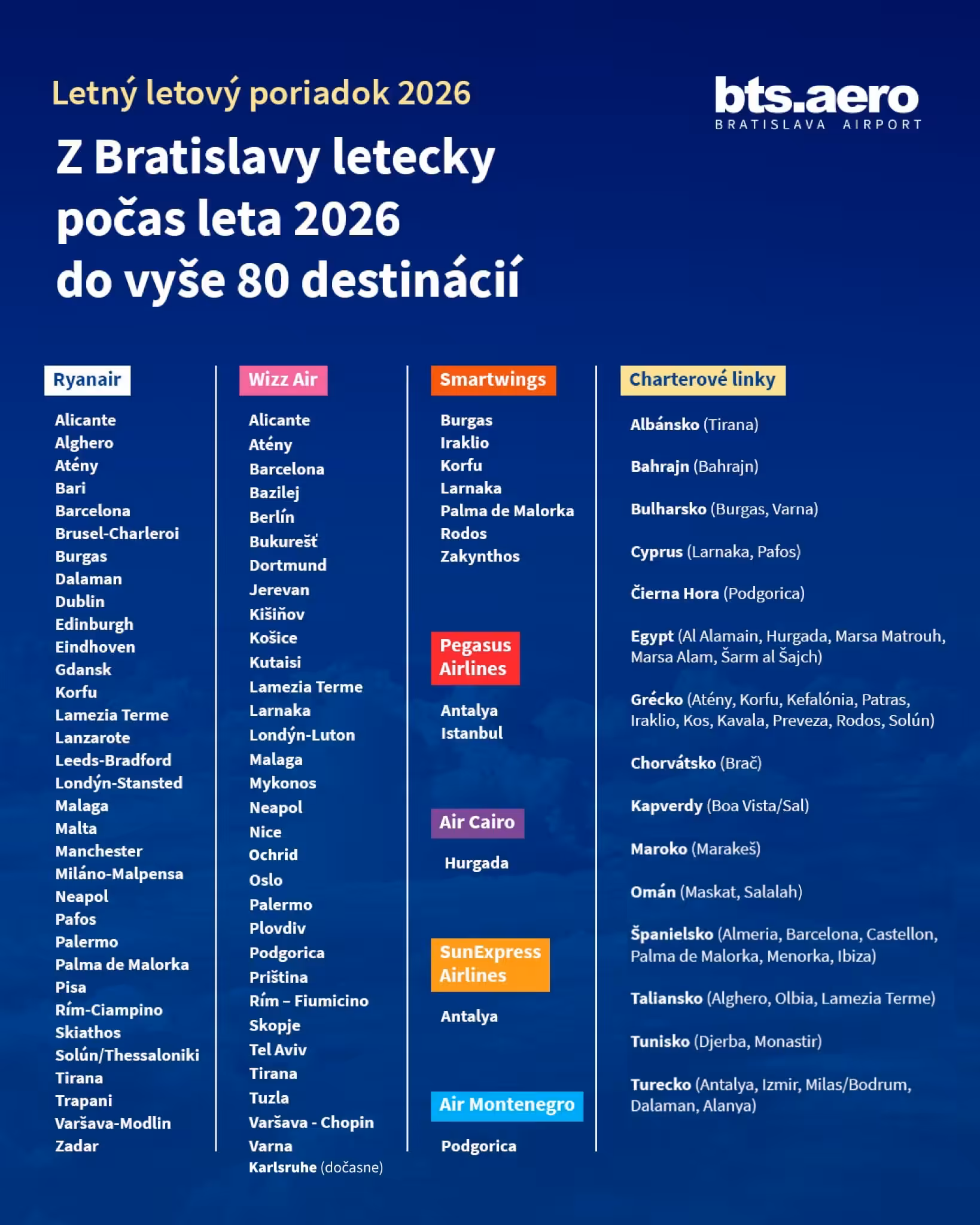 Významnú úlohu majú aj ďalší dopravcovia. Smartwings bude zabezpečovať 7 pravidelných liniek, najmä do dovolenkových destinácií. Pegasus Airlines ponúkne lety do Antalye a Istanbulu, pričom na trase do Antalye ho doplní nový hráč SunExpress Airlines, ktorý vstupuje na bratislavský trh po prvý raz.