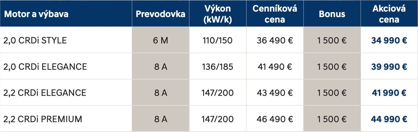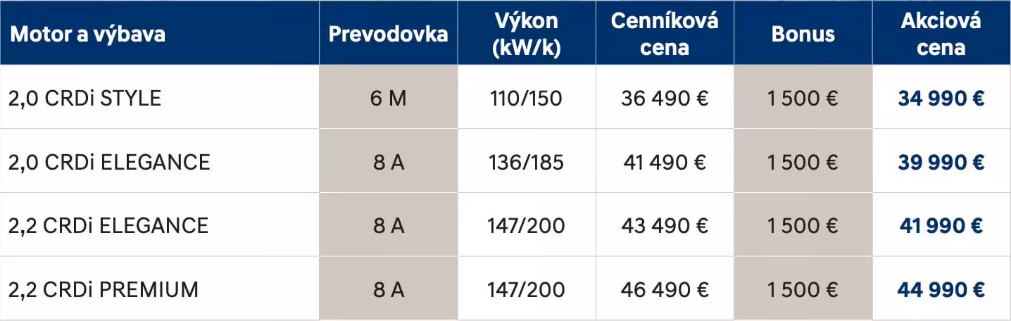 Nedávno predstavený Hyundai Santa Fe štvrtej generácie má slovenský cenník. Základom ponuky veľkého SUV značky Hyundai je 5 miest na sedenie a 2-litrový diesel so 6-štupňovou manuálnou prevodovkou. A cenovka? Hyundai sa dokázal zmestiť pod sumu 35-tisíc eur.