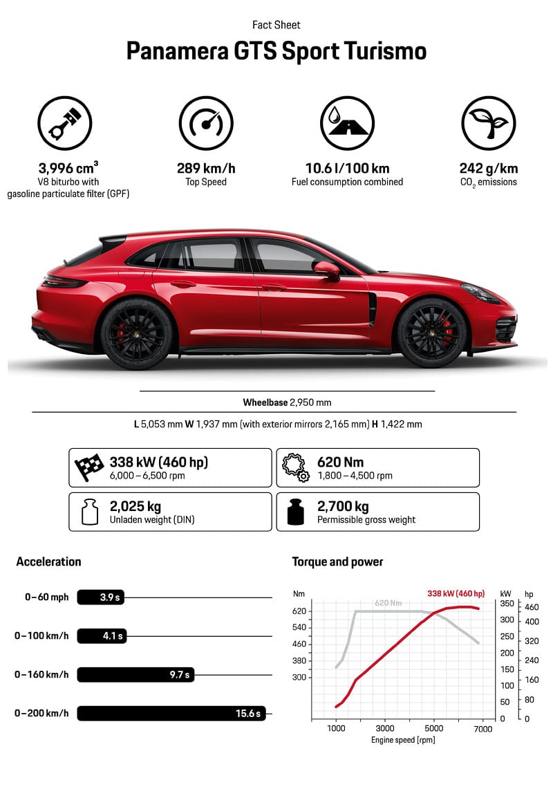 Motor je taktiež vyzbrojený aj proti emisným normám filtrom pevných častíc. Pohonný agregát je spriahnutý s osemstupňovou dvojspojkovou automatickou prevodovkou PDK a pohonom všetkých kolies. Panamera tak vďaka tomuto súzvuku technológií dokáže z pokoja na hranicu 100 km/h vystreliť len za 4,1 sekundy. Maximálka sa zastaví na hranici 292 km/h, v prípade rodinného kombi Panamera GTS Sport Turismo je to 289 km/h.