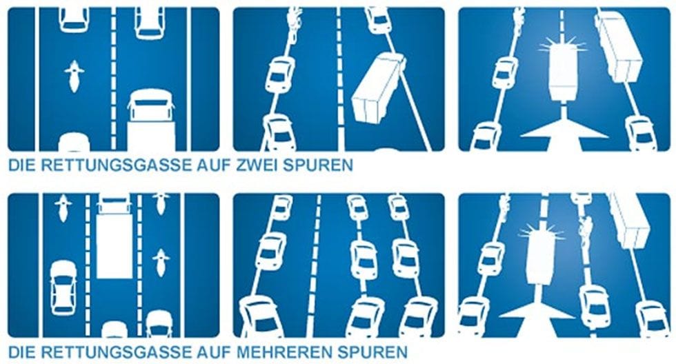Napríklad v susednom Rakúsku sa núdzový pruh tvorí nasledovne: v prípade dvoch pruhov sa autá v oboch pruhoch odstúpia čo najviac ku kraju vozovky. To znamená, že vozidlá v ľavom jazdnom pruhu sa odstúpia čo najviac vľavo a vozidlá v pravom jazdnom pruhu čo najviac vpravo. V prípade vozovky s viac ako dvomi jazdnými pruhmi sa jazdný pruh úplne vľavo odstúpi čo najviac vľavo a ostatné pruhy čo najviac vpravo. Rovnaké pravidlo platí aj v Nemecku. Situácia je názorne ukázaná na obrázkoch: