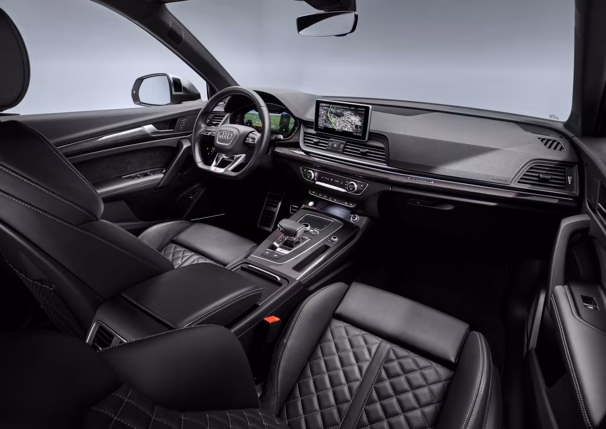 Audi už dlhé roky prekonáva svojich nemeckých konkurentov skvelým a takmer bezchybným spracovaním interiéru. Inak tomu nie je ani pri novom SQ5 TDI. Kam až oko dovidí – všade samé kvalitné, na dotyk mäkké materiály a koža. Prvá vec, čo udrie vodičovi do očí je multifunkčný kožený volant tvaru D s kontrastným prešívaním. Nachádzajú sa na ňom všetky prvky potrebné pre ovládanie vodičovho informačného systému a príplatkového Audi virtual cockpit-u. Sedadlá s označením “S” sú spracované veľmi dobre a ponúkajú dostatok opory pri rýchlych prejazdoch zákrutami a nadštandardný cestovný komfort. V základnej výbave sú čalúnené kožou a alkantarou, avšak za príplatok môžu byť vyhrievané a čalúnené kožou Nappa.