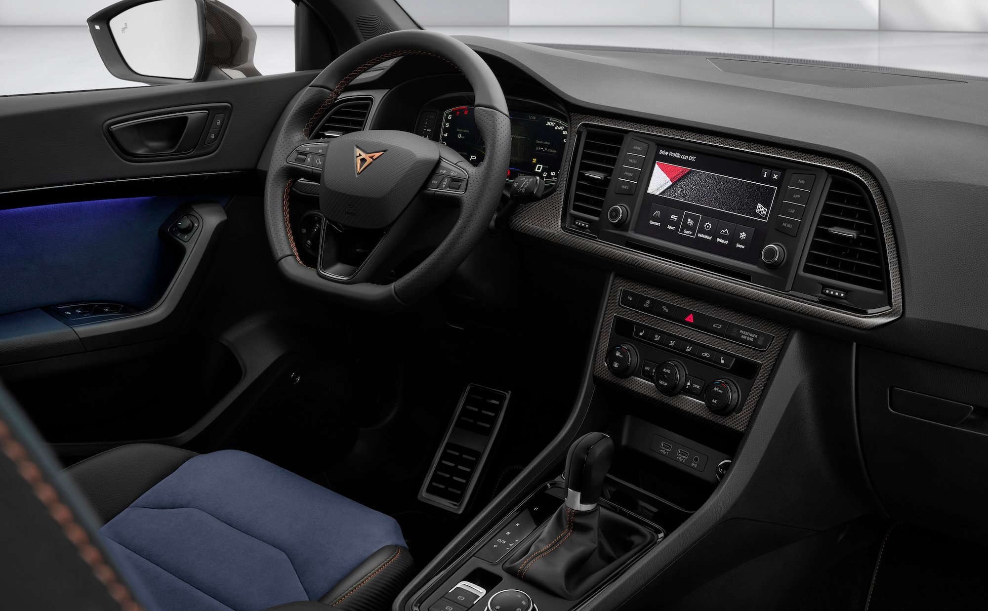 Čo sa týka interiéru, tak tu nastali asi najzásadnejšie zmeny. Fanúšikovia silných áut Cupre Ateca vyčítali použitie “klasických” sedadiel, ktoré brzdili jej potenciál. Automobilka teda vypočula ich volanie a do Special Edition implementovala už v sérii športové sedadlá potiahnuté alcantarou v prevedení “Petrol blue”. Okrem toho sa rovnaký materiál dostal aj na výplne dverí. Že sa skutočne myslelo aj na detaily, dokazuje použitie karbónových doplnkov v okolí výduchov klimatizácie či ovládacích prvkov.