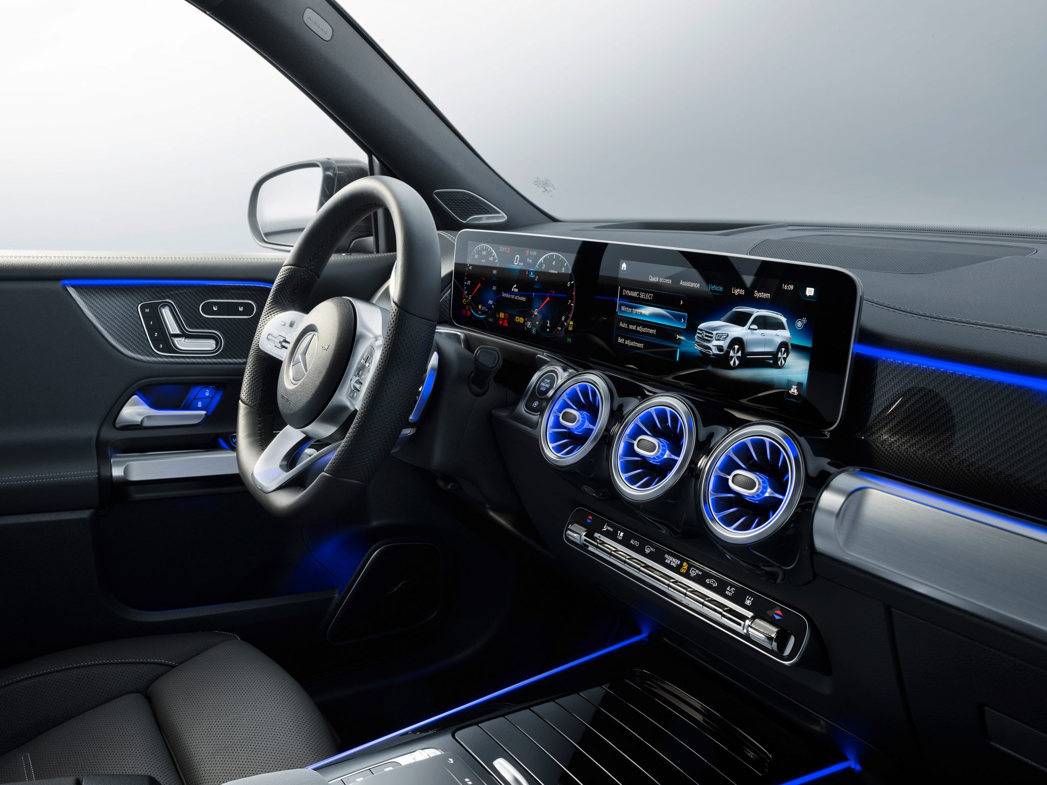 Nechýba ani infotainment MBUX s podporou pre Apple CarPlay a Android Auto. Asistenčné systémy sú taktiež prítomné v početnom zastúpení. Adaptívny tempomat, asistent pre jazdu v pruhoch či sledovanie mŕtveho uhlu. V prípade verzií s pohonom 4Matic je možné vybaviť SUV príplatkovým balíkom Off-road Engineering, čím GLB nadobudne aj funkcie do terénu. Medzi nimi je napríklad režim Off-road, kontrolovaný zjazd a pokročilé technické nastavenia.