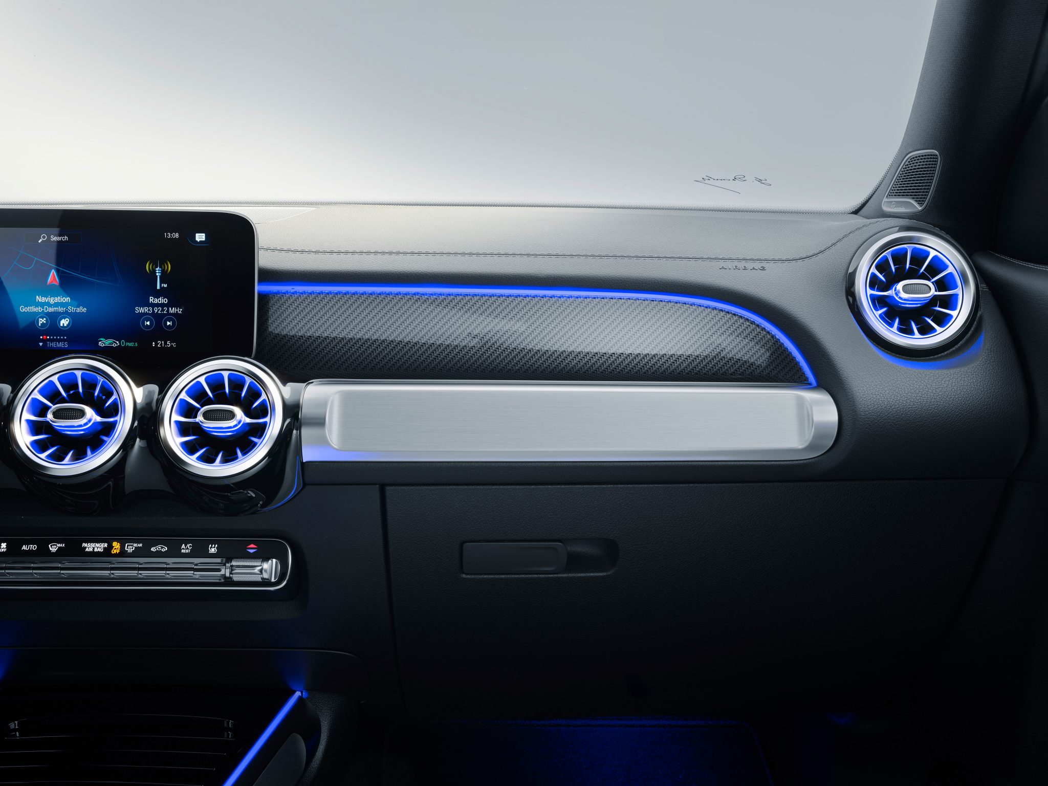 Okrem pohodlia môžu cestujúci v poslednom rade využívať aj plnohodnotné vybavenie. K dispozícií sú držiaky na nápoje či USB porty a pre rodiny aj ukotvenie pre detské autosedačky ISOFIX. Objednať je ale samozrejme možné aj päťmiestny variant. V takom prípade ponúka GLB 560 litrov batožinového priestoru, čo je o 140 litrov viac ako má Audi Q5. Po sklopení druhého radu sedadiel je to v prípade Mercedesu však až 1755 litrov. Samotný dizajn interiéru nie je žiadnym prekvapením. Preberá prvky známe zo súčasnej generácie modelov značky. Veľkú spojenú dvojicu obrazoviek, výduchy pripomínajúce turbíny a tak ďalej.