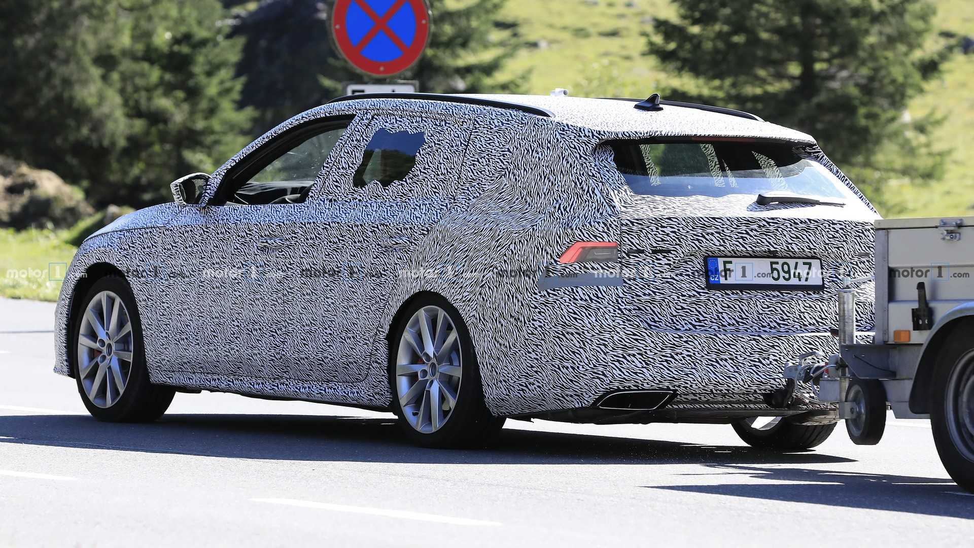 Čím je nové RS-ko zaujímavé? Už na prvý pohľad je vidieť, že karoséria kombíku bude skutočne viac nafúknutá. To sa nepochybne odrazí na vnútorných rozmeroch a hlavne na objeme kufra. Aj keď je vozidlo veľmi precízne zakumuflované, môžeme vidieť jeho športové črty. Masívny predný nárazník sa mierne odvoláva na dizajn súčasnej Octavie RS. Spod kamufláže vyčnievajúce hmlovky taktiež. Ďalším prvkom, ktorý napovedá športový charakter vozu sú červené strmene bŕzd. Ako je už známe, aj aktuálna generácie RS má rovnakú farbu a preto niet pochýb, že sa pozeráme na testovací prototyp očakávanej novinky.