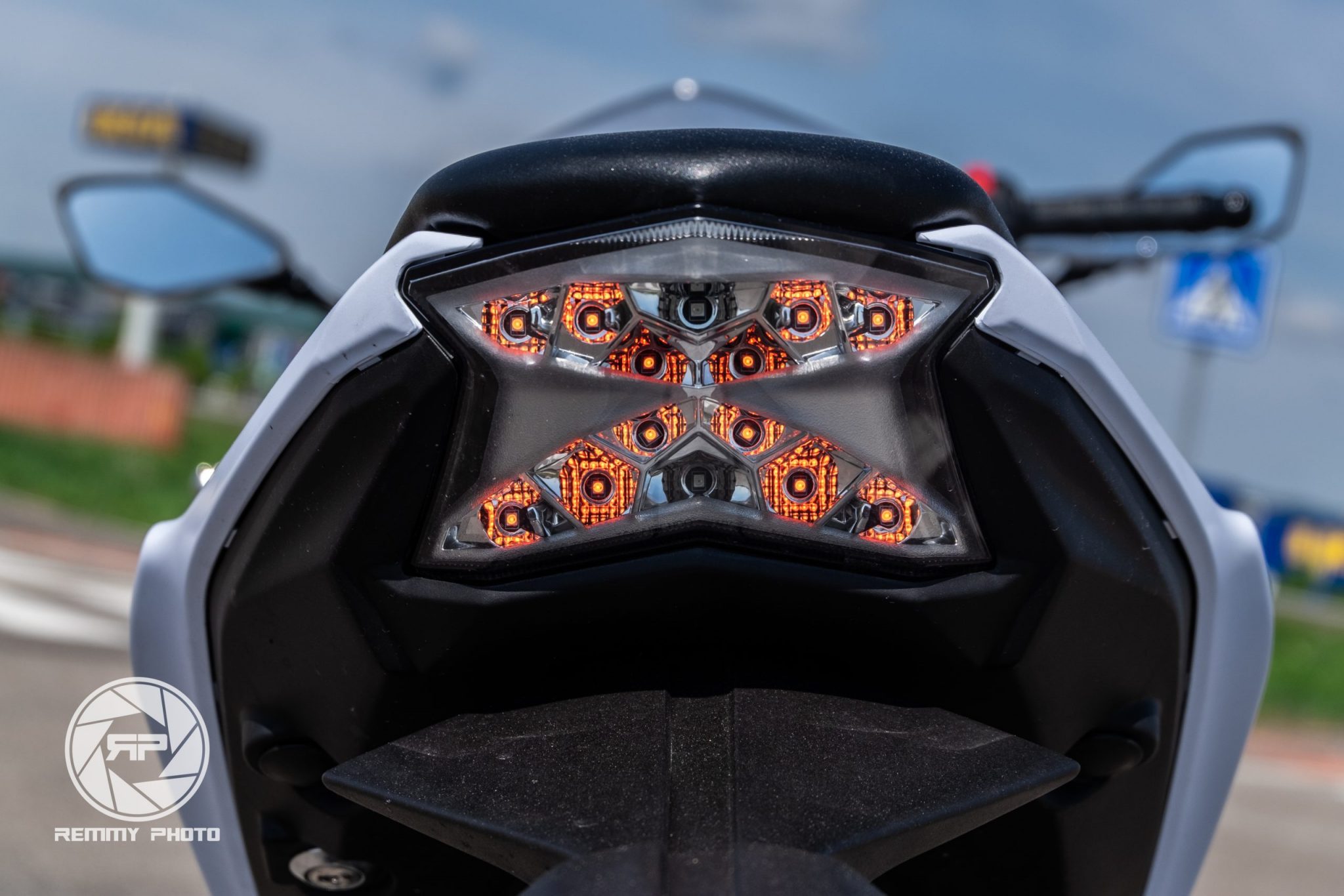 O zastavenie sa zase postarajú vpredu duálne 300-milimetrové poloplávajúce kotúče s axiálne namontovanými dvojpiestikovými strmeňmi od značky Nisin a vzadu je 220-milimetrový kotúč s jednopiestikovým strmeňom. Brzdy sú pekne dávkovateľné a podľa nás aj trošku „kúsavé“, čo nám ale vyhovovalo.