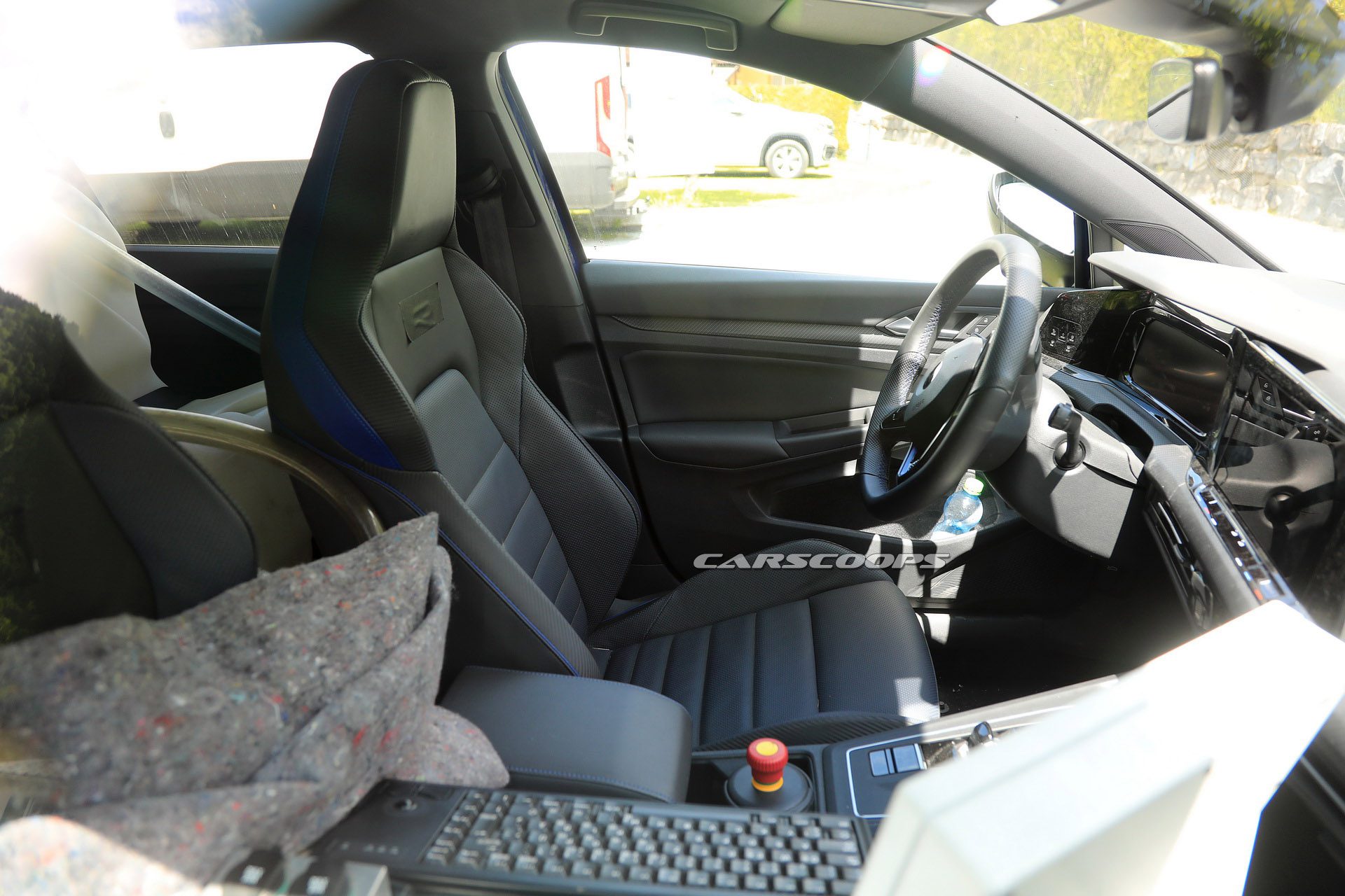 Fotografie tiež zachytávajú aj interiér, ktorý je rovnako maskovaný len minimálne. Oproti konvenčnej verzii kompaktu strednej triedy tu bohužiaľ veľa rozdielov nenájdeme. Ten najväčší bude azda v použití športových sedadiel. Je to tak trochu škoda. Niežeby ôsma generácia Golfu nemala pekný interiér, ide skôr o športového ducha auta. Možno by nezaškodilo použitie prémiovejších materiálov akým je hliník alebo uhlíkové vlákna. Tak by auto dostalo osobitejší charakter a na svoju silu by odkazovalo nielen navonok, ale aj zvnútra.