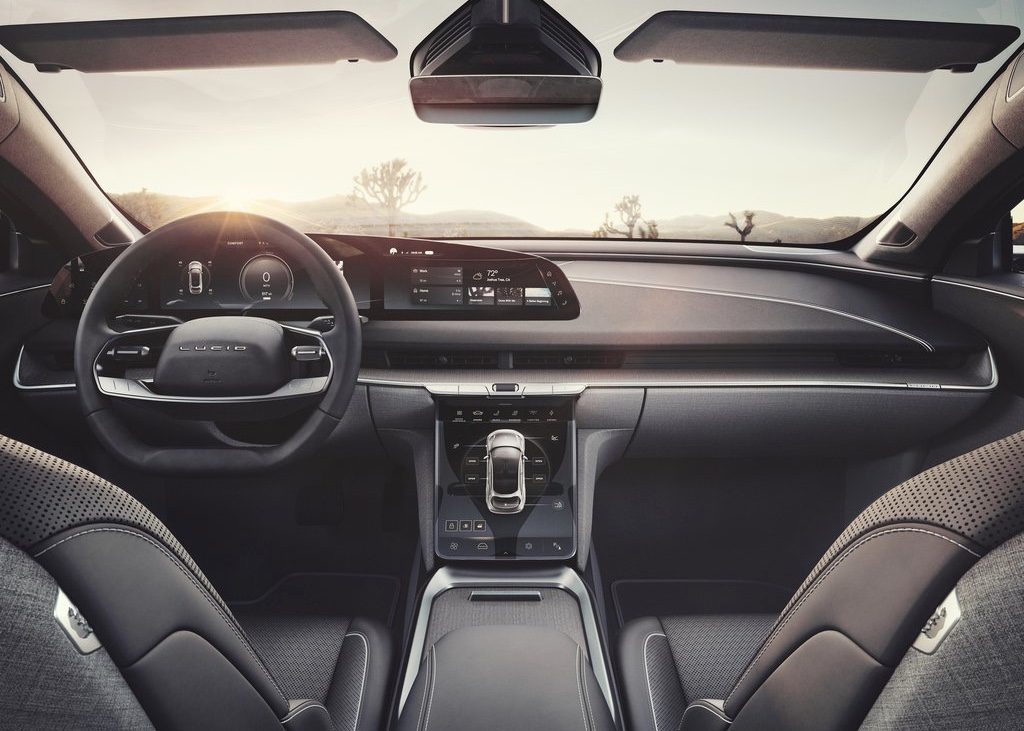 Futuramu nebude cítiť len zvonka vozu. Lucid Air ponúkne unikátny interiér, ktorý bude mať až až 34” displej s rozlíšením 5K. Ten bude navyše zahnutý a bude zaberať priestor pred vodičom ako prístrojová doska. Na tomto displeji budú zobrazované všetky dôležité informácie ohľadom jazdy a zábavy na palube. Lucid Air navyše ponúkne unikátne čelné sklo, ktoré bude zasahovať až hlboko do interiéru a tým pádom presvetlovať miesto pre cestujúcich. Ďalší displej, ktorý sa nachádza v interiéri, bude slúžiť na ovládanie multimediálnych funkcií a pokročilých nastavení auta. Tento ovládací panel bude navyše možné zasunúť do prístrojovej dosky, a tým sa pod ním otvorí miesto pre odkladanie rôznych vecí. Oba displeje budú navyše pokryté tvrdeným sklom čo samotnému interiéru dodá punc elegancie.