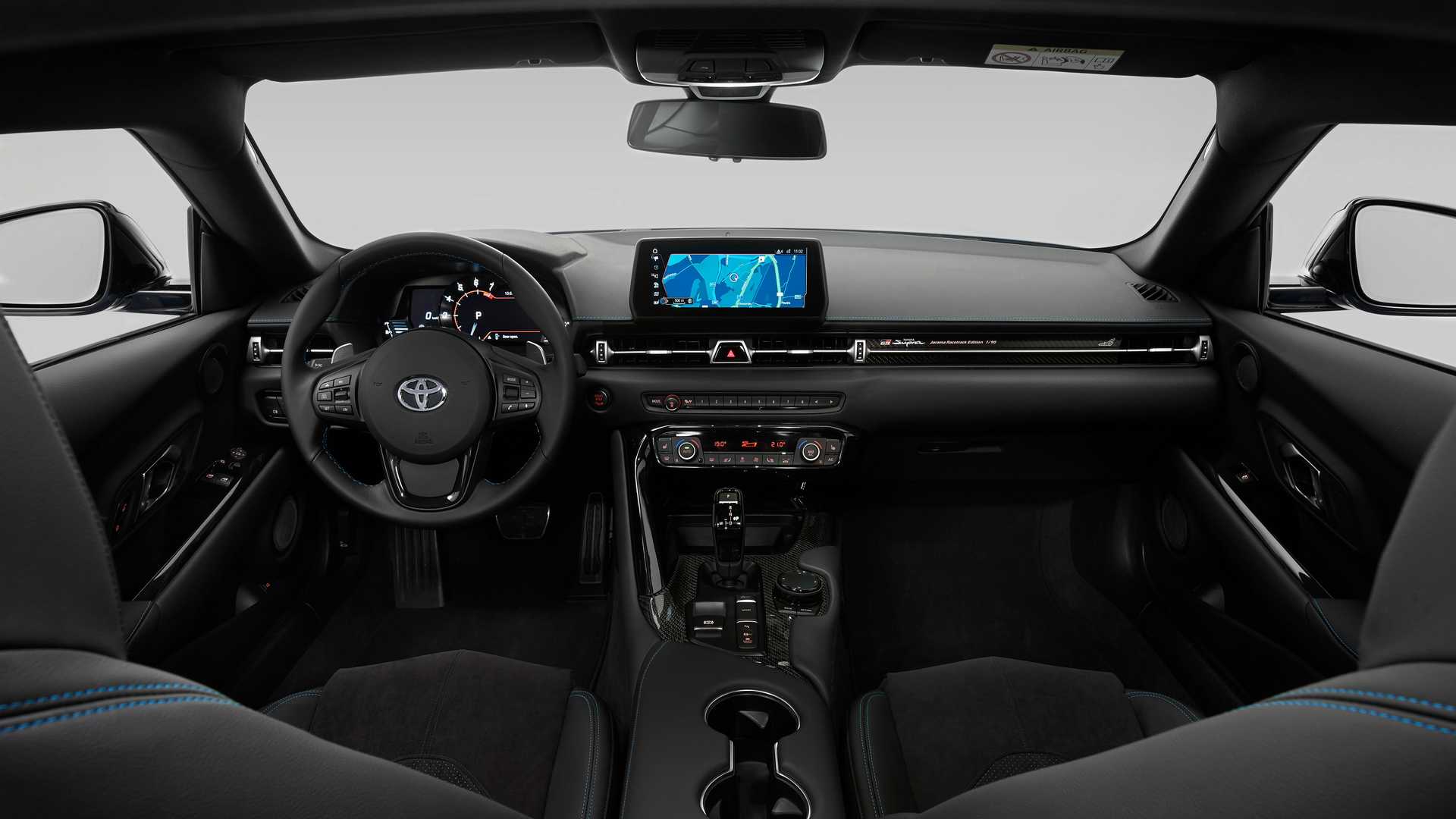 Na prvý pohľad si môžeme všimnúť výrazné, špeciálne modré lakovanie Horizon Blue a taktiež 19-palcové čierne kolesá a dočervena lakované strmene bŕzd. V modrej farbe pôsobí Supra naozaj zaujímavo a jedinečne. Čierne kolesá jej dodávajú tmavší kontrast a brutálnejší výzor.
