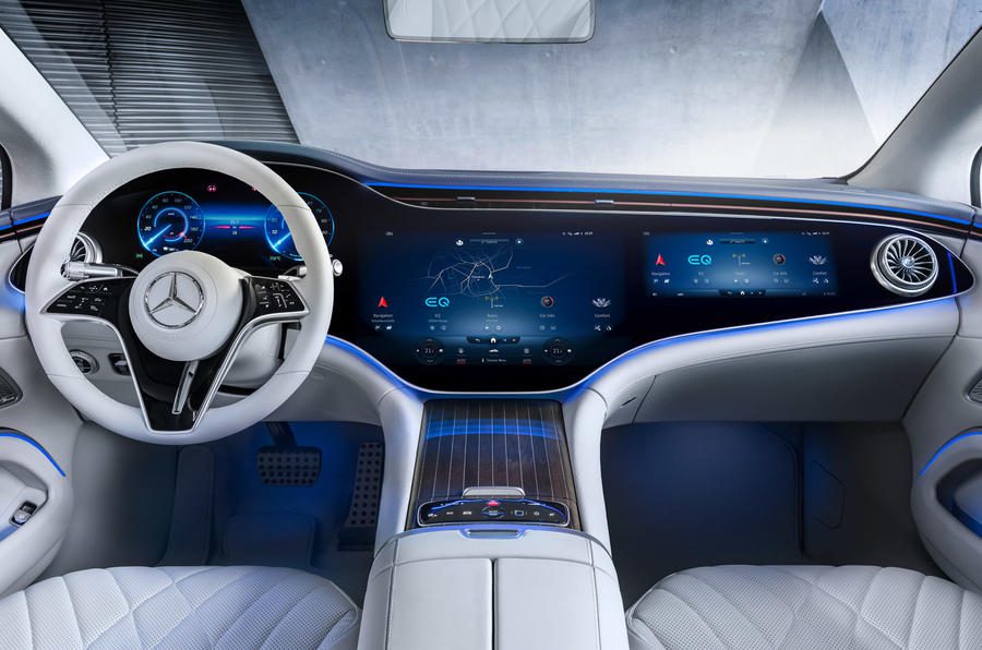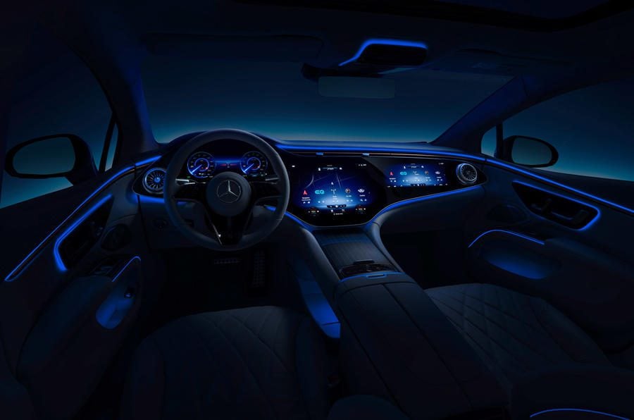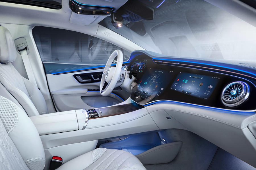 Interiér vozidla má svoju vlastnú a jedinečnú palubnú dosku, ovladácie a ozdobné prvky. Volant nesie podobný štýl ako už v spomínanej triede S. Stredom prechádza vysoko položený stredový tunel s viacerými úložnými priestormi. Zákazníci si budú môcť do EQS navoliť nový digitálny MBUX Hyperscreen, ktorý sa bude skladať z trochu samostatných displejov. Sú umiestnené za spoločným zakriveným panelom so šírkou až 141 cm a sú ovládané najnovšou verziou operačného systému MBUX.