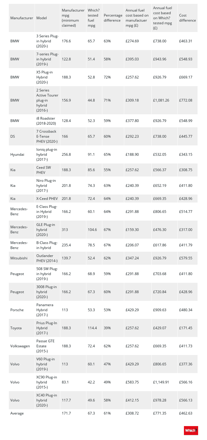 Tvrdenia výrobcu o spotrebe paliva vychádzajú z testovacieho cyklu WLTP, ktorý je oficiálnym štandardom od roku 2017. WLTP metodika nahradila dnes už neexistujúci NEDC cyklus, pretože sa považoval za nerealistické znázornenie skutočných jazdných podmienok. Britský magazín Which? otestoval plug-in hybridy na vlastnom testovacom okruhu, ktorý replikuje jazdu v reálnej premávke.