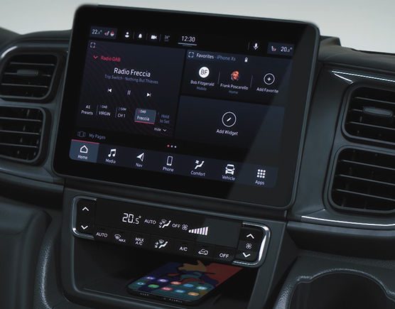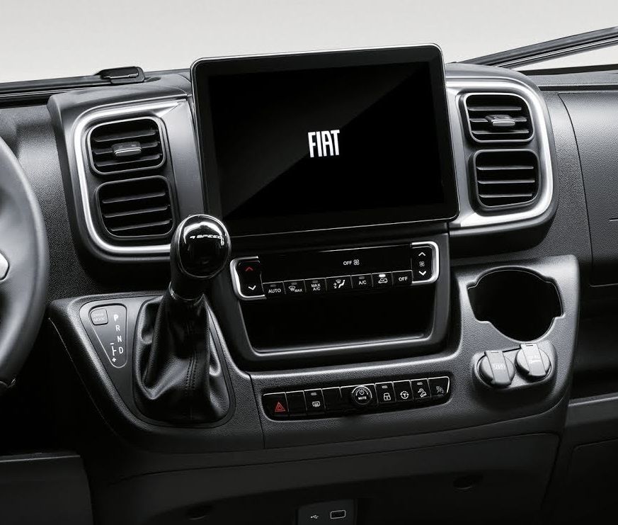 Dotyková plocha, lepšie povedané infotainment príde do Ducata vôbec prvý krát. 5, 7 alebo 10“ infotainment bude možnosťou voľby. Dva najvyššie budú disponovať funkciou AppleCarPlay či AndoidAuto a to obe bezdrôtové. V dodávke sa bude nachádzať aj bezdrôtové nabíjanie smartfónov, dva USB porty, či 230 V zásuvka.