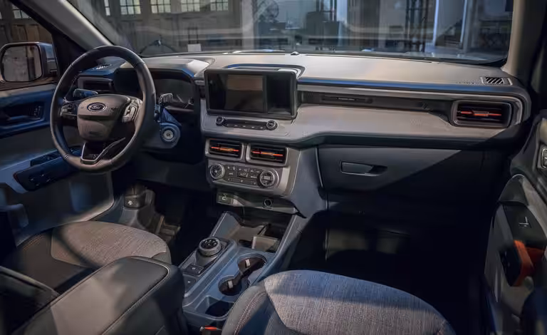 Všetky modely Maverick majú 8,0-palcový dotykový displej s infotainmentom. Interiér je plný úložných priestorov, vrátane toho pod zadnými sedadlami. Slúži pre predmety, ako sú väčšie fľaše s vodou a náradie a iné. Spoločnosť Ford použila pre panely dverí plávajúcu lakťovú opierku, aby sa zachovalo viac úžitkového priestoru aj v kabíne. Možnosti WiFi, Apple CarPlay a Android sú štandardom v Mavericku. Modely na základnej a strednej úrovni majú ručne nastaviteľné látkové sedadlá, ale špičkový model Lariat je inovovaný na elektricky nastaviteľné sedadlá z umelej kože. Držať sa štandardného hybridu znamená o niečo menej priestoru pre nohy v druhom rade sedadiel. Za hybrid sa platí aj zmenšeným priestorom.