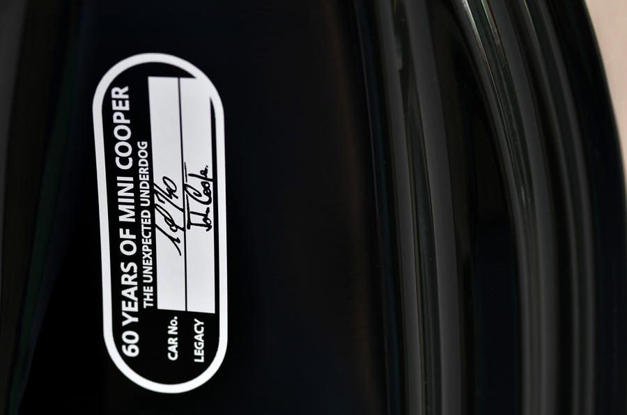 Medzi ďalšie prvky patrí zatmavené zadné sklo a originálne logo spoločnosti Cooper Car Company na ozdobných lištách prahov dverí, bočných lištách, stĺpikoch C a volante. Ručne písaná tabuľka zaznamenáva individuálne číslo každého vozidla. Nesie nápis „60 rokov Mini Cooper – The Unexpected Underdog“.