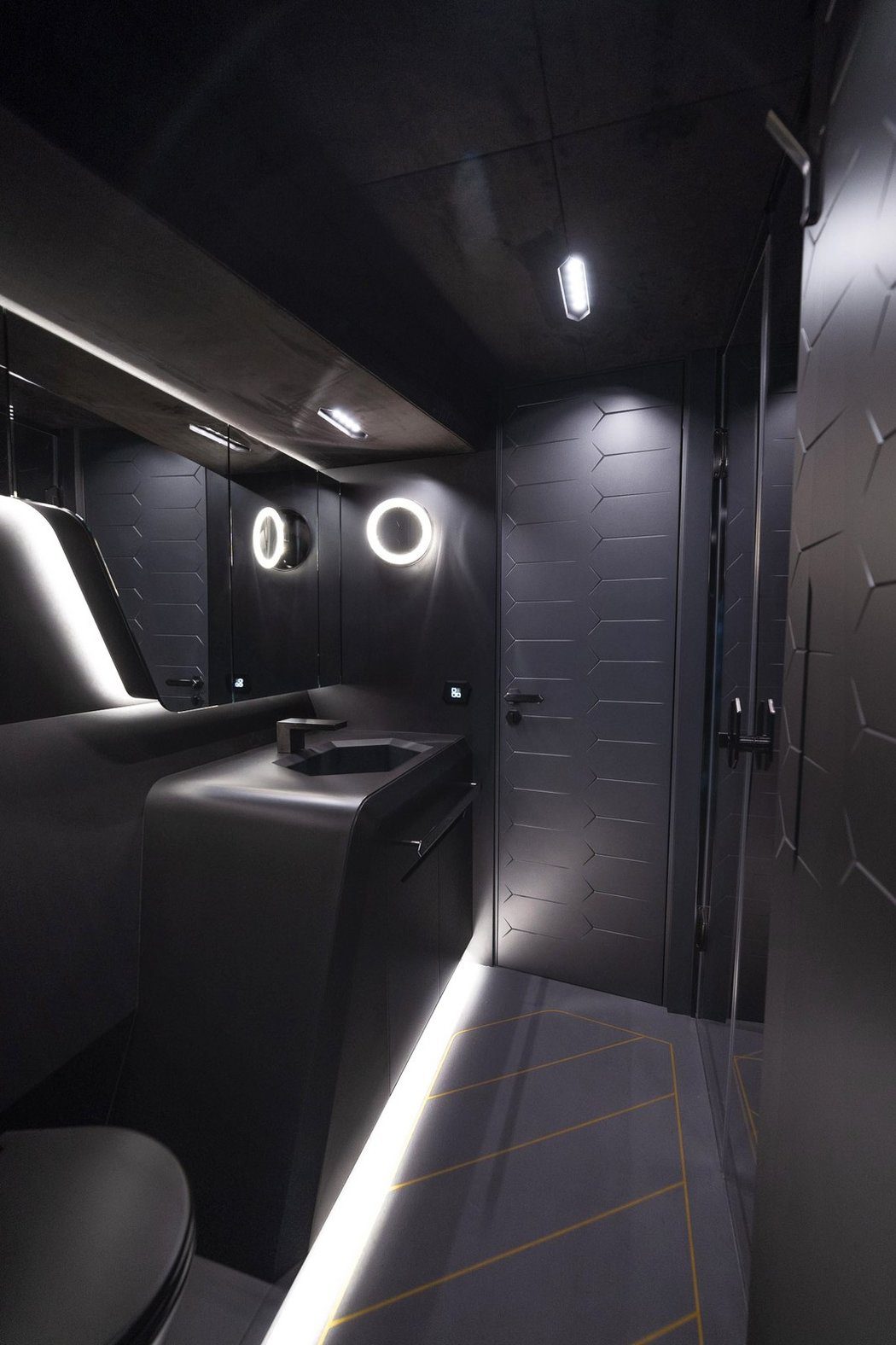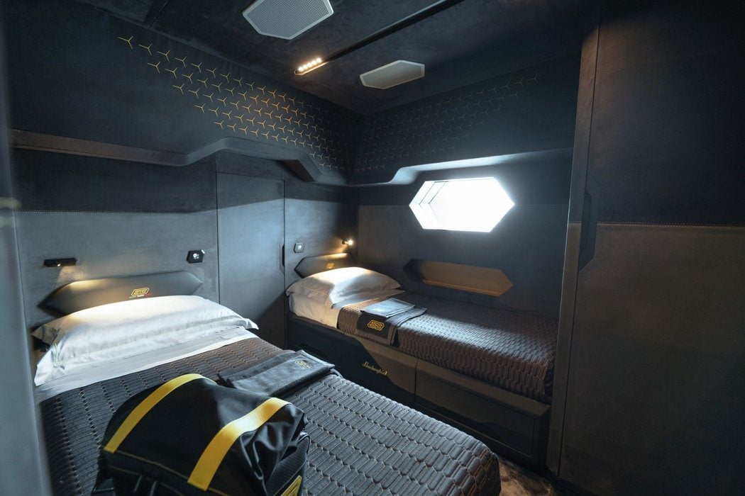 Čo sa týka interiéru jachty, tiež tu nájdeme mnoho detailov z kabíny modelov Lamborghini. Napríklad ako kormidlo je použitý volant z vozidiel a štartovacie tlačidlo priamo z automobilky. Športový nádych dodávajú škrupinové sedačky a digitálna prístrojovka. V jachte sa tiež nachádza manželská posteľ, ktorá pripomína vozidlá Lamborghini, do jachty sa vošla aj ďalšia izba s dvomi oddelenými posteľami a samozrejme nechýba ani špičková kúpeľňa ladená tiež do čiernych farieb. Zákazníci si môžu vybrať prevedenie jachty podľa vlastného vkusu.