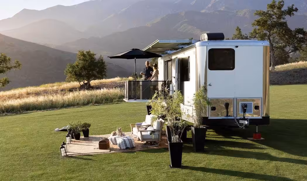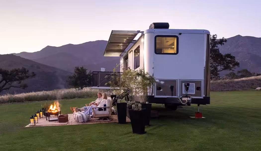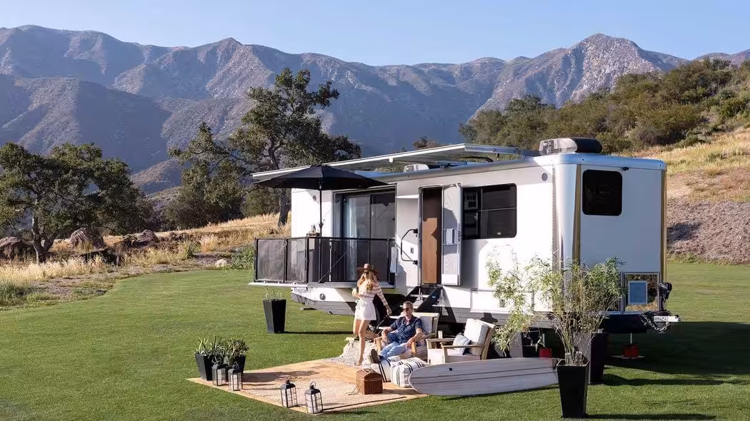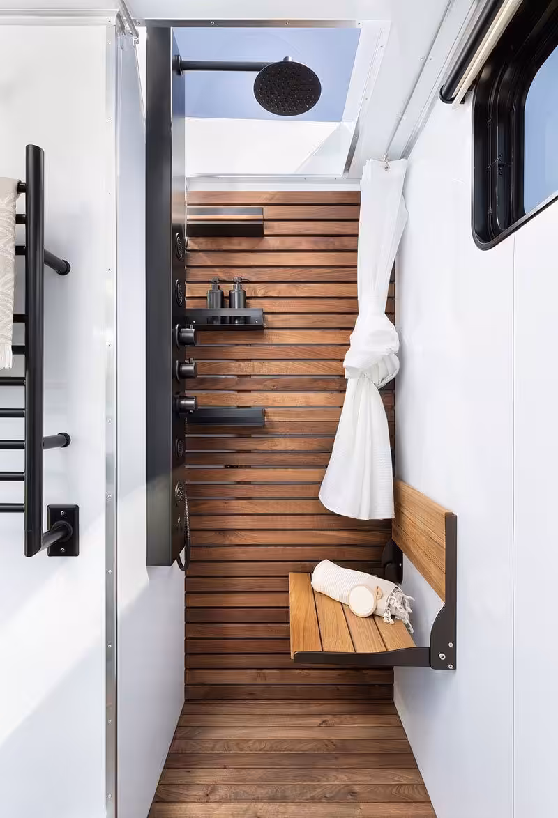 Okrem toho obytný príves ponúka plne integrovaný sklápací balkón, ktorý dokáže udržať 680 kilogramov váhy, teda všetkých členov posádky a gril navyše. Luxus podčiarkuje aj moderná kúpelňa, ktorá ponúka takzvanú “dažďovú” sprchu, ktorá čerpá vodu z 380-litrovej vodnej nádrže.