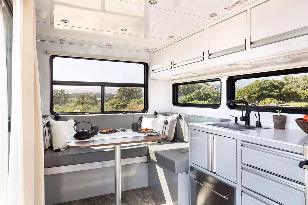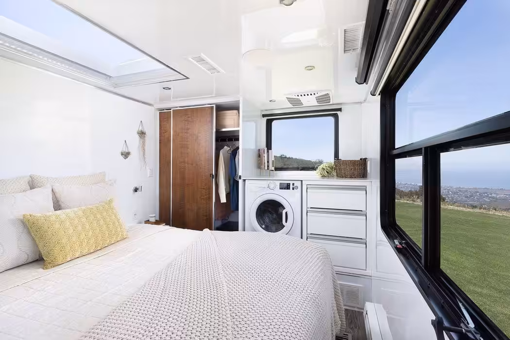 Namiesto “útulného” karavanu máte k dispozícii úctyhodných 21,5 metra štvorcového luxusne zariadeného obytného priestoru. Nechýba napríklad 70-palcový 4K televízor v takzvanej “mediálnej miestnosti” (čo je v podstate spálňa s televízorom, sound systémom a projektorom). Zábavu dopĺňa praktická vstavaná kuchynská linka so spotrebičmi (chladnička, trúba, sporák s tromi horákmi), či práčka so sušičkou. Áno, v karavane.