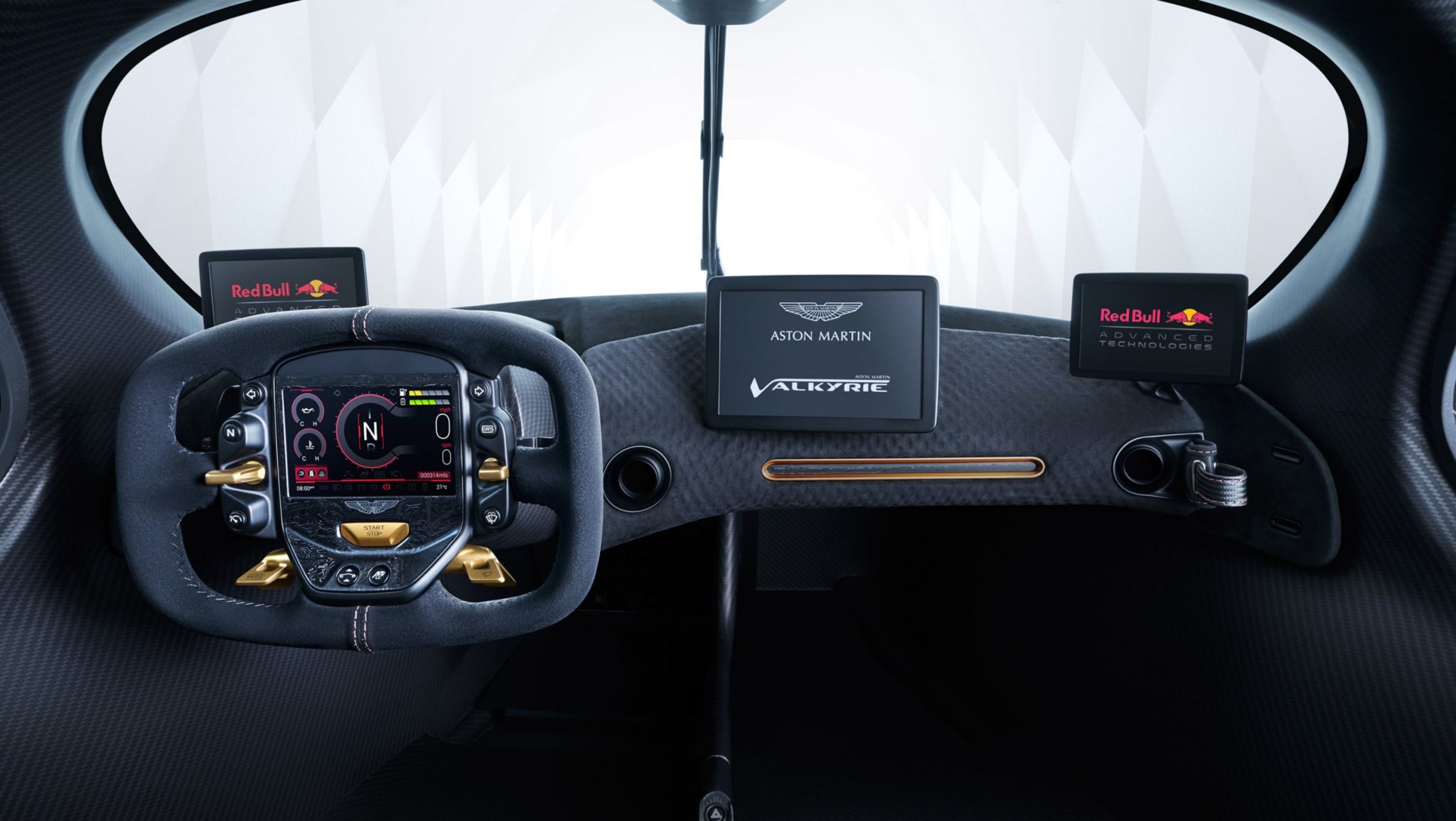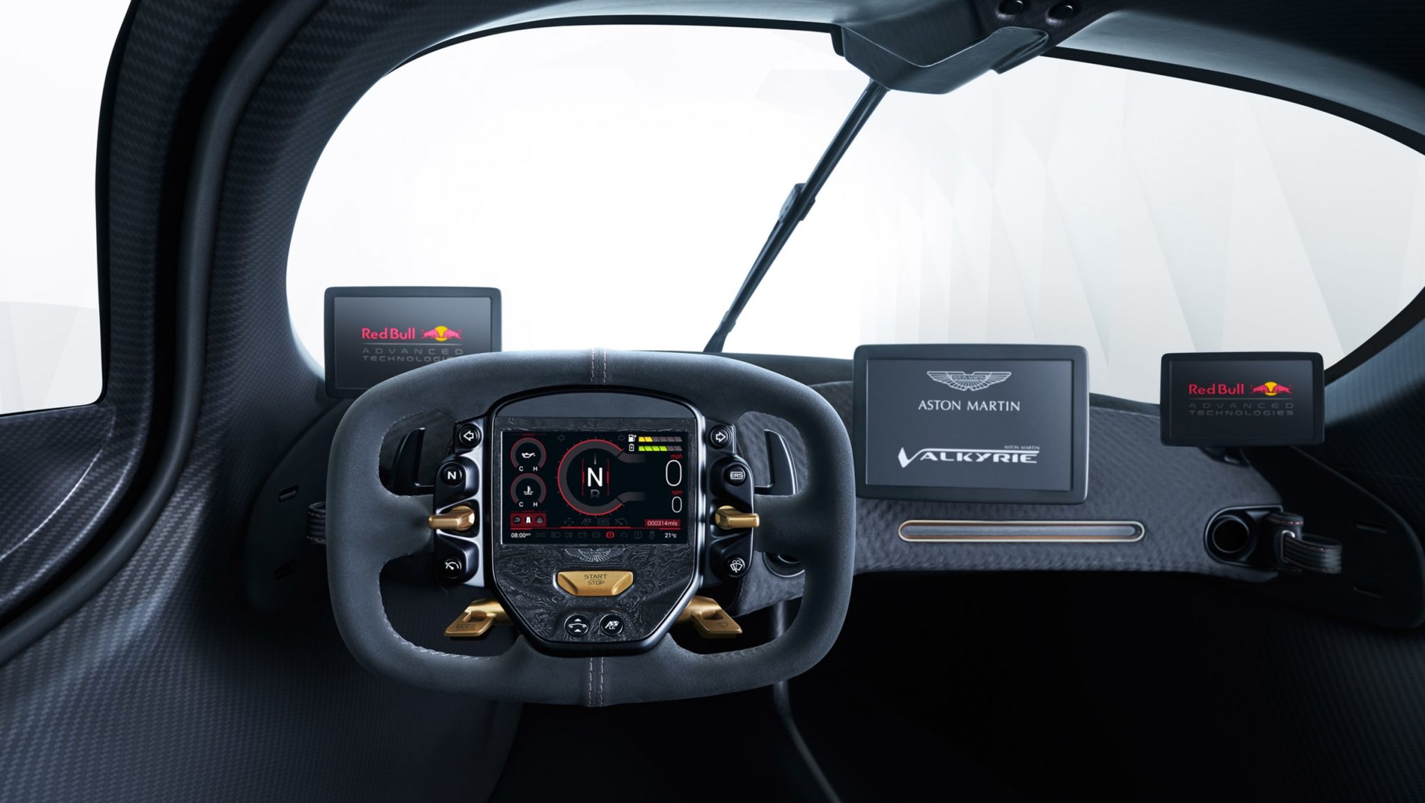 Interiér Valkyrie je symfóniou minimalizmu, pričom väčšinu viditeľných povrchov zdobia nahé uhlíkové vlákna. Interiér obsahuje iba niekoľko tlačidiel a centrálny dotykový displej. Zdá sa, že volant je priamo z vozidla Le Mans. Skupina tlačidiel a prepínačov namiesto bežných páčok má úlohu ovládať ovládacie prvky a funkcie jazdy.