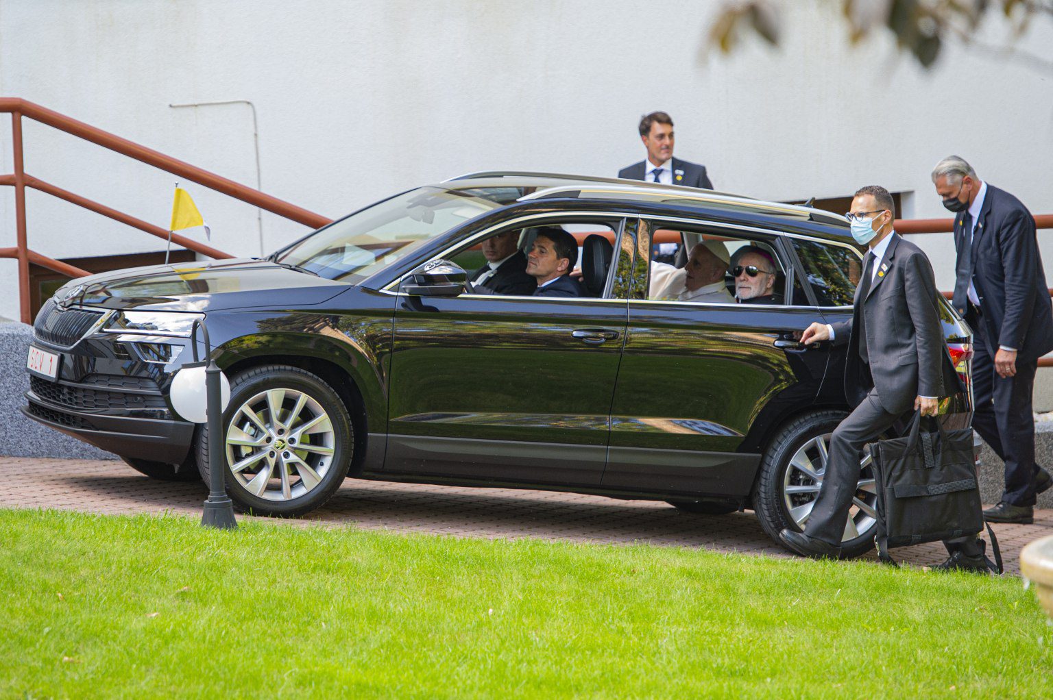 Vráťme sa však ku autám. Všetky vozidlá sú odeté do čiernej metalickej farby s čiernym interiérom. Hlava cirkvi tak cestuje v špeciálne upravených vozidlách českého výrobcu. Na predných blatníkoch na strane spolujazdca sú umiestnené chrómové držiaky, ktoré počas cesty nesú vatikánsku vlajku.