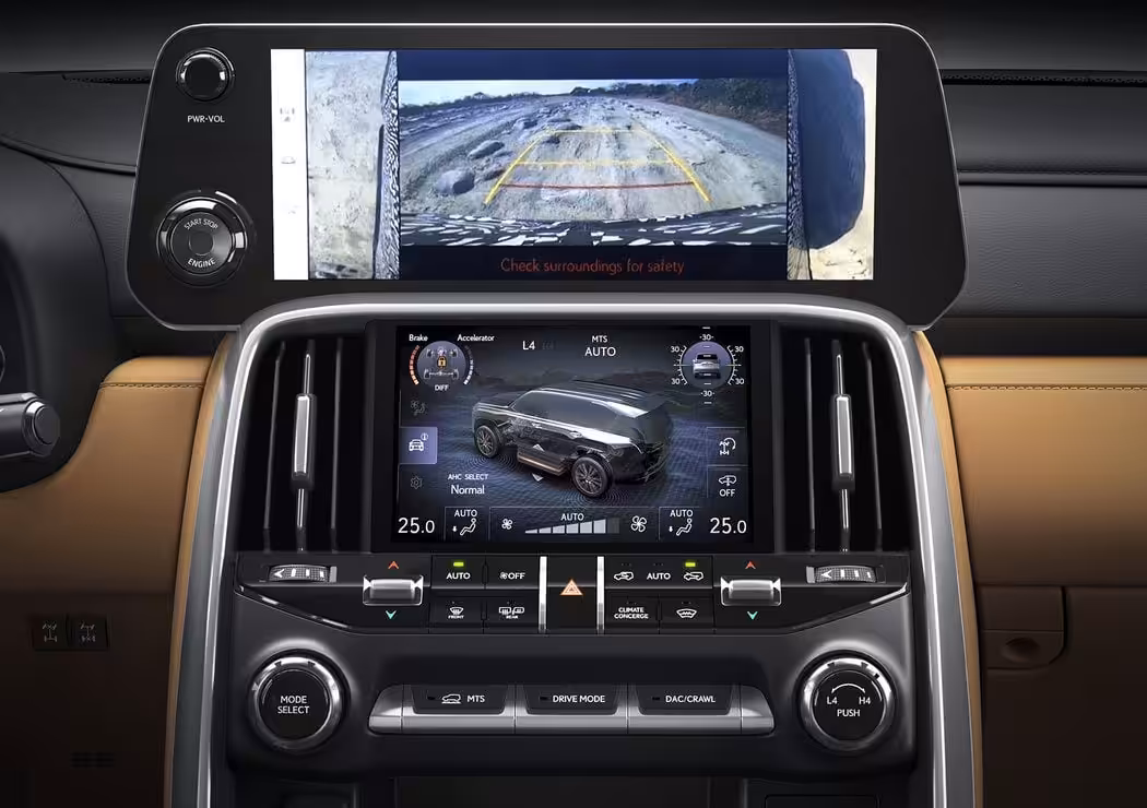 Na palube môžeme vidieť hneď dve dotykové obrazovky. Vyššie umiestnený displej s uhlopriečkou 12,3-palca zobrazuje ovládanie audia, navigácie a tiež informácie terénneho režimu Multi-Terrain-Monitor. Dolná obrazovka s uhlopriečkou 7-palcov nadväzuje na stredový tunel a disponuje prístupom ku ovládaniu klimatizácie. Súčasne dokáže spolupracovať aj s režimom Multi-Terrain, kde sa zobrazujú rôzne offroadové informácie alebo zábery z kamier.