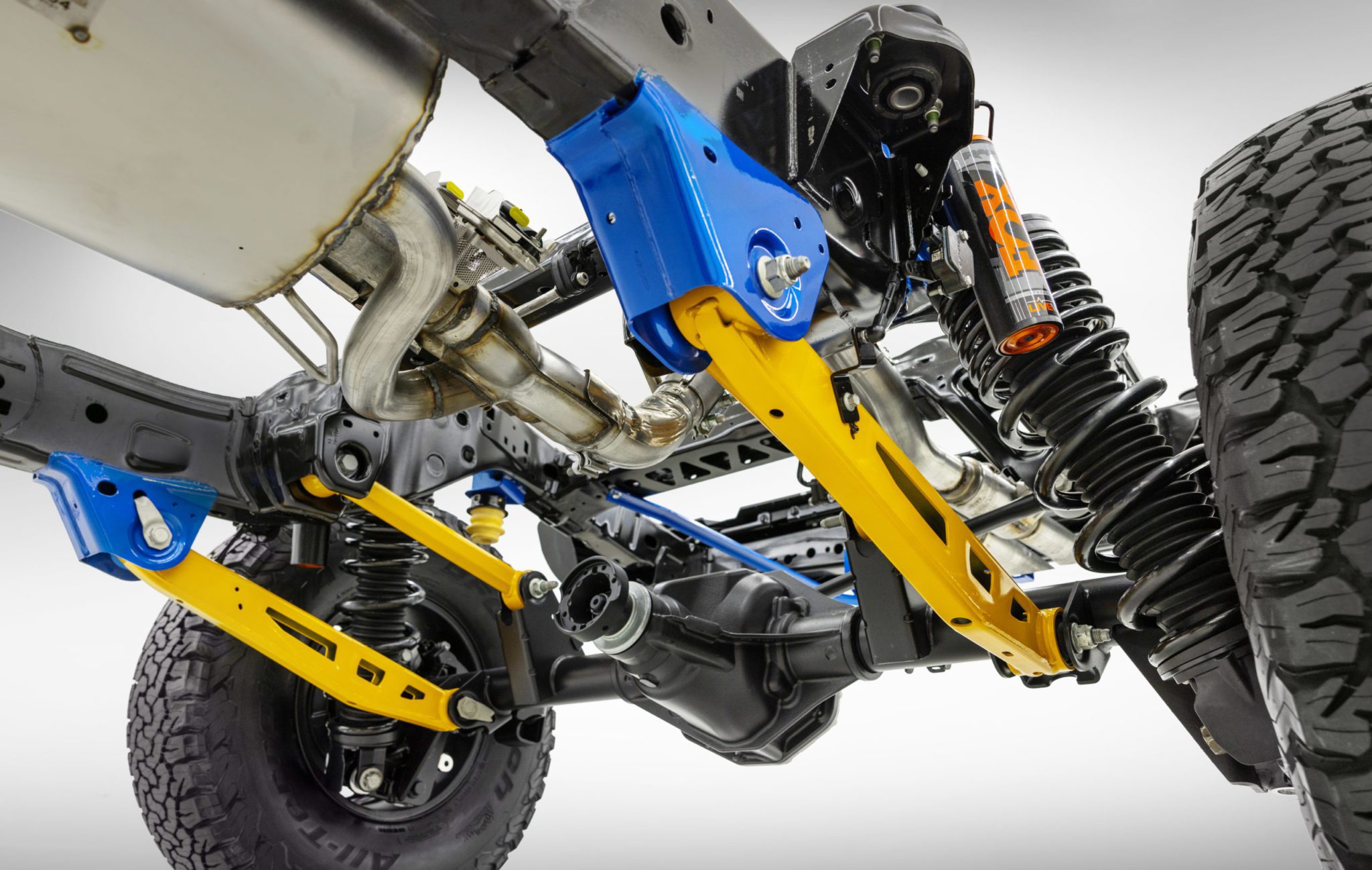 Bronco Raptor dostal zosilnený rám a rovnako aj karosériu vďaka čomu dosahuje až o 50 % vyššiu torznú tuhosť oproti štandardnej verzii. Automobilka vymenila aj obidve nápravy za silnejšie a širšie o približne 22 cm. Okrem toho sa zosilnili tlmičové domce, stabilizátory, tyč riadenia, čapy a mnoho ďalšieho. Extrémny americký offroad ponúka svetlú výšku vyše 33 centimetrov. Približne rovnakú hodnota vyznačuje aj dráhu predného pruženia a vzadu sa dokonca jedná o 35,5 cm. Prepracovaný podvozok dostal adaptívne tlmiče od firmy Fox Racing. Bronco Raptor môže byť hrdý na predný nájazd s uhlom až 47,2 stupňa a vzadu 40,5 stupňa. Prejazdový uhol má hodnotu 30,8 stupňa.