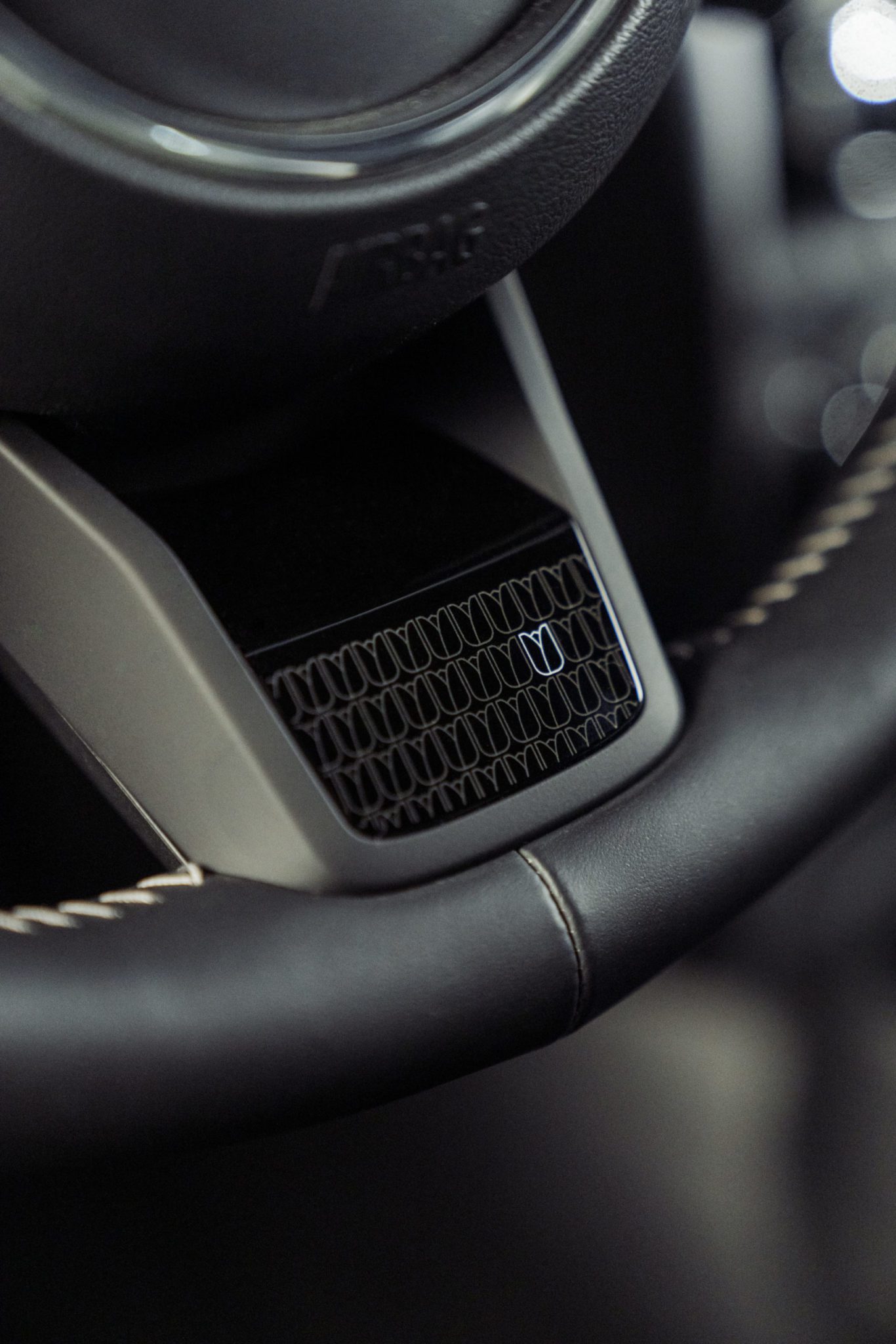 Podpis pretekárky sa nachádza aj na čiernom vnútornom povrchu v priestore pred spolujazdcom. Kožený volant nesie emblém edície v podobe grafiky tulipánov, ktorá sa nachádza na spone spodného ramena. Abstraktné zobrazenie pohybujúcich sa piestov motora hore a nadol slúži ako motív grafiky na vnútornej ploche na strane vodiča. S ramenami rôznych výšok v tvare písmen M a W – čo znamená Moss a Wisdom – symbolizujú perfektne zladenú jazdeckú dvojicu.
