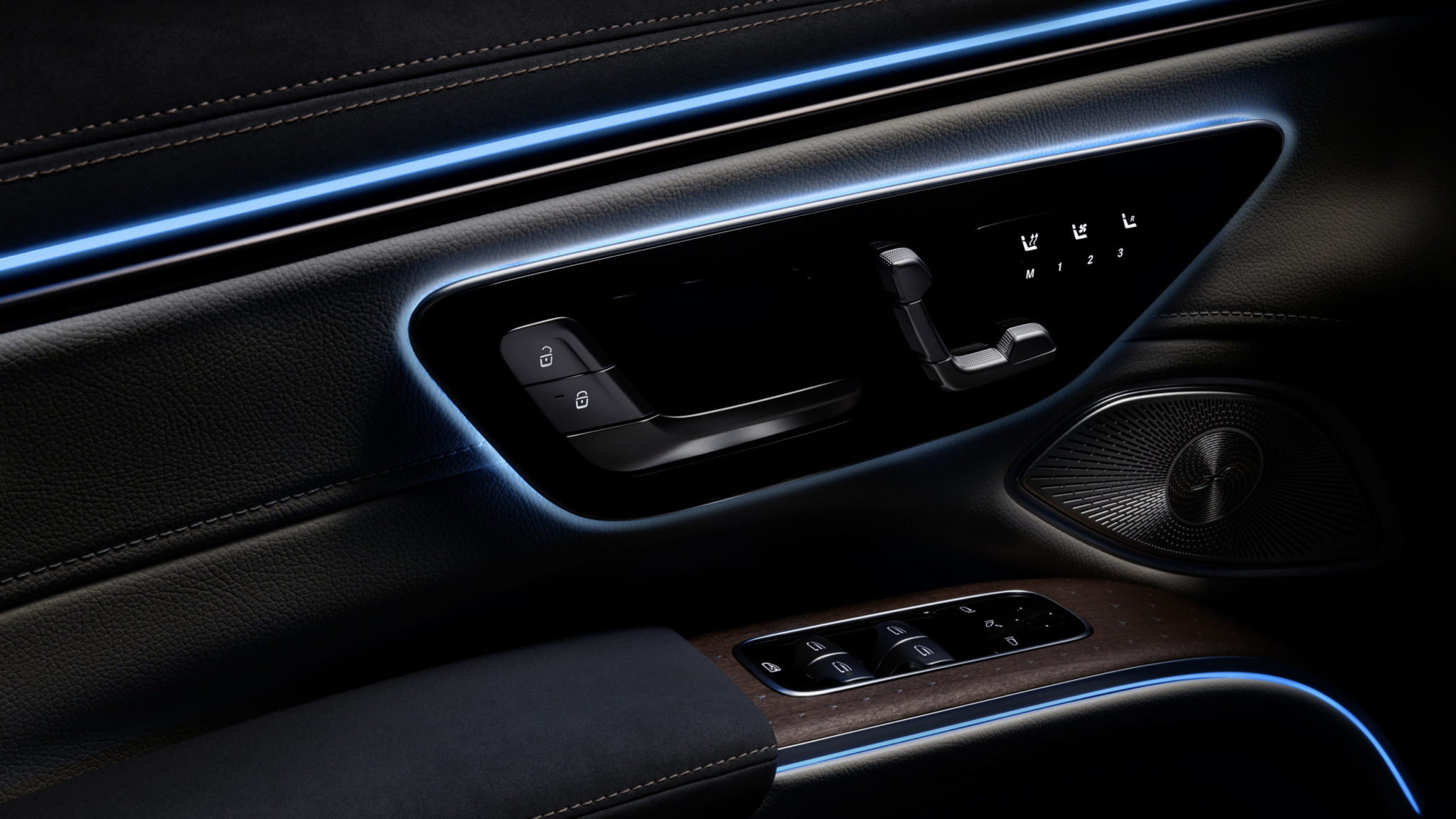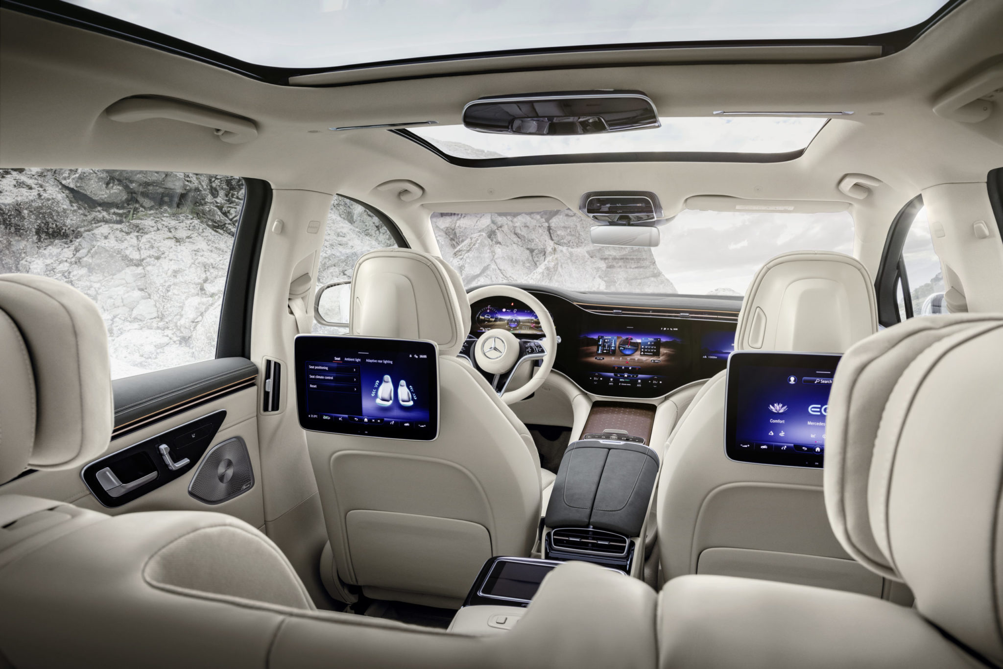 Pri elektromobile neprekvapí, že štandardom budú zapustené kľučky dverí. Za príplatok si kabínu môžete presvetliť panoramatickým strešným oknom pozostávajúcim z dvoch modulov. Hrdlo nádržky pre kvapalinu ostrekovačov je podobne ako v prípade sedanu EQS integrované nad ľavým predným blatníkom. Prednú kapotu bude možné otvoriť iba v servise.