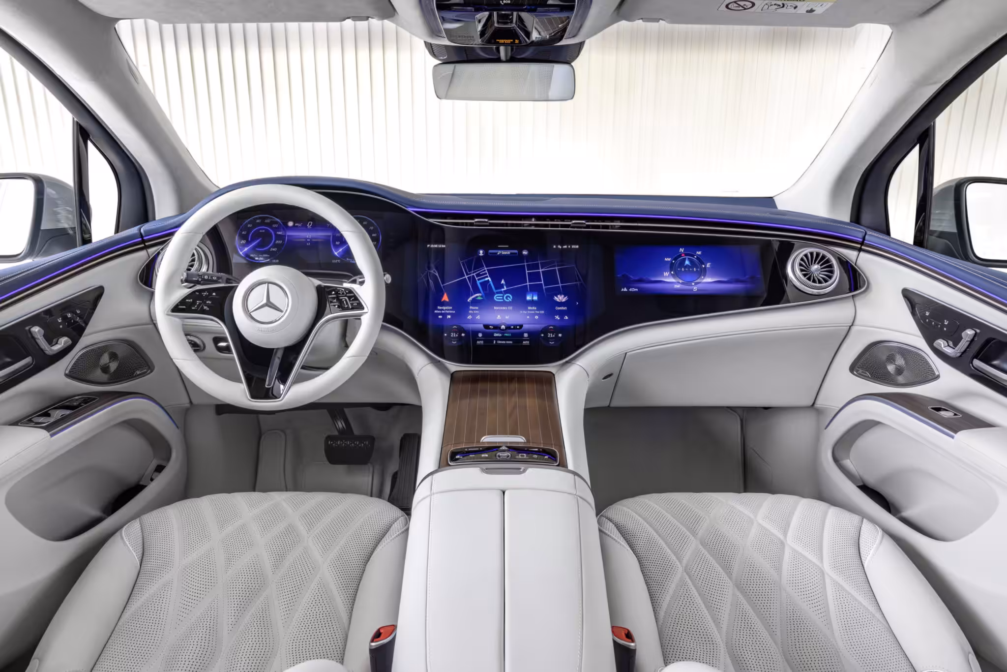 Pri elektromobile neprekvapí, že štandardom budú zapustené kľučky dverí. Za príplatok si kabínu môžete presvetliť panoramatickým strešným oknom pozostávajúcim z dvoch modulov. Hrdlo nádržky pre kvapalinu ostrekovačov je podobne ako v prípade sedanu EQS integrované nad ľavým predným blatníkom. Prednú kapotu bude možné otvoriť iba v servise.