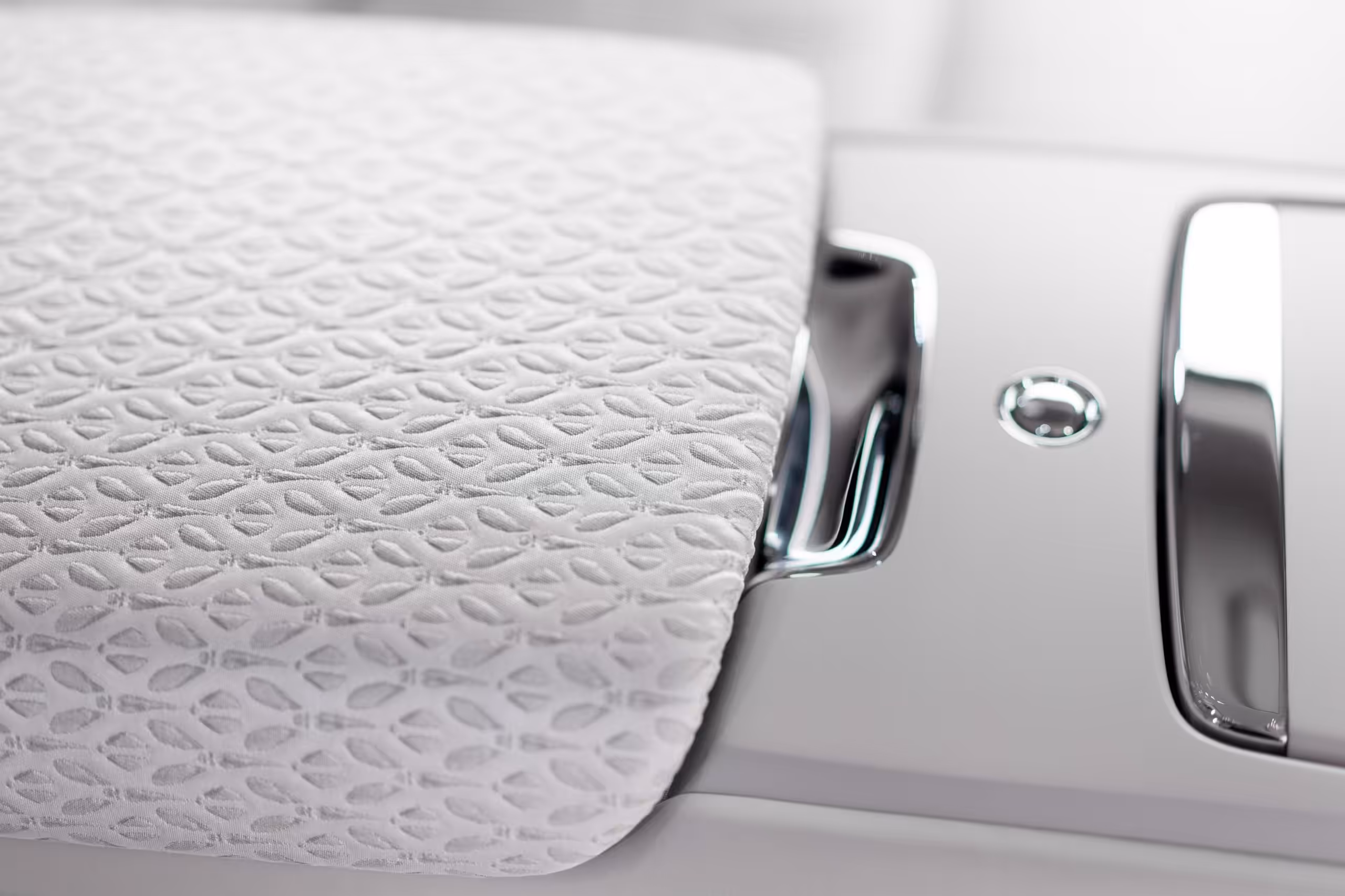 Oba materiály zdieľajú originálny opakujúci sa vzor založený na abstraktnej interpretácii Spirit of Ecstasy. V hodvábnej textílii je dizajn menší a votkaný do látky, aby vytvoril vizuálne stimulujúci povrch. Objavuje sa aj na kľúčových dotykových bodoch, ako sú lakťová opierka či stredová konzola. Na bambusovej látke sú vyšívané väčšie ikony, ktoré predstavujú všívaný vzhľad, ktorý sa bežne vyskytuje v interiérovom dizajne. Tento odolnejší materiál je umiestnený na spodných prvkoch interiéru, kde budú musieť vydržať kontakt s cestujúcimi.