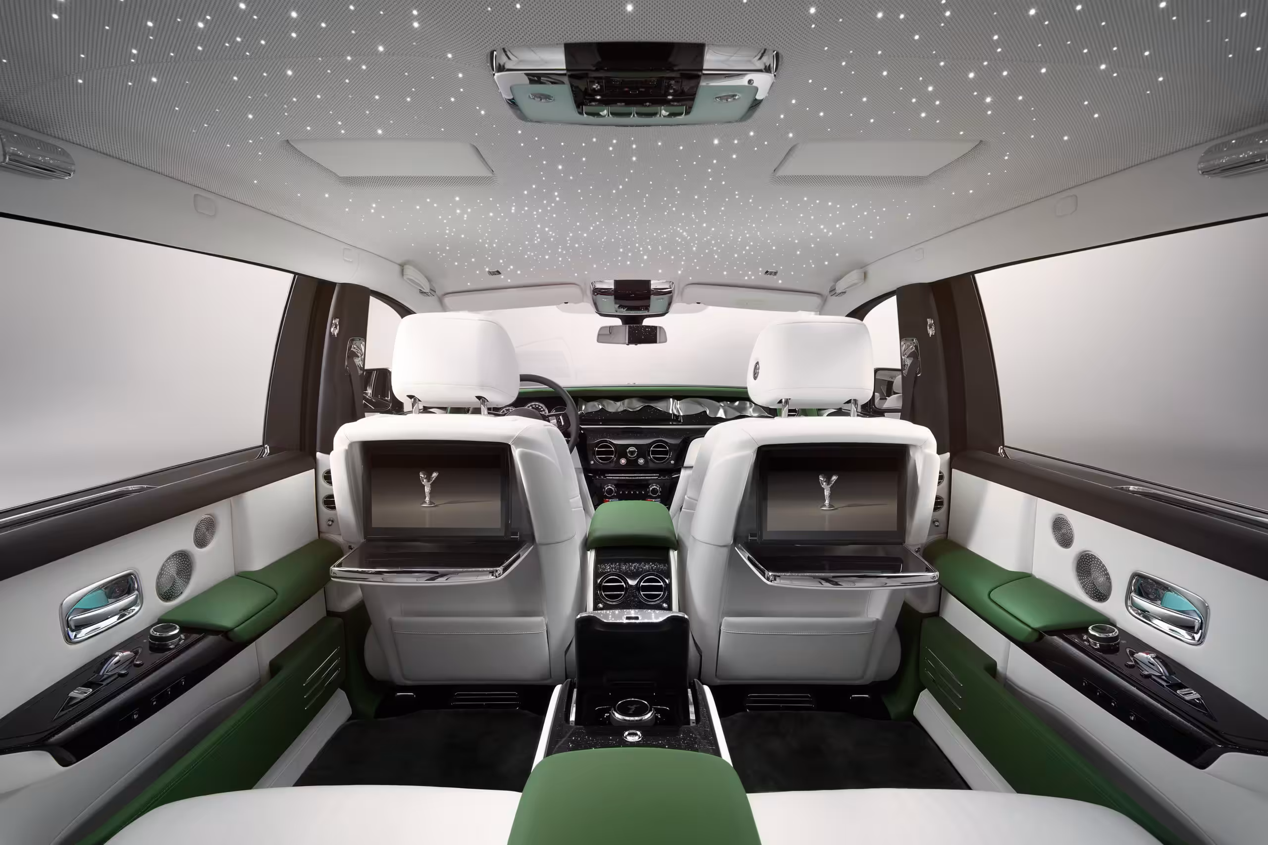 Rovnaký dizajn sa objavuje aj na prístrojovej doske. Jej okraj je vyrobený z 3D tlačenej keramiky. Tónové vlastnosti interiéru, zasadené do ľadového dreva, posúvajú Phantom na krásnu a neprekonateľnú úroveň opulentnosti. Najväčším magnetom na oči vo Phantome je Starlight Headliner. V jedinečnom dizajne vytvorenom špeciálne pre Rolls-Royce Platino sú „hviezdy“ umiestnené tak, aby ťahali pohľad dozadu, pričom rozmarné padajúce hviezdy sledujú široký oblúk vzoru.
