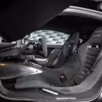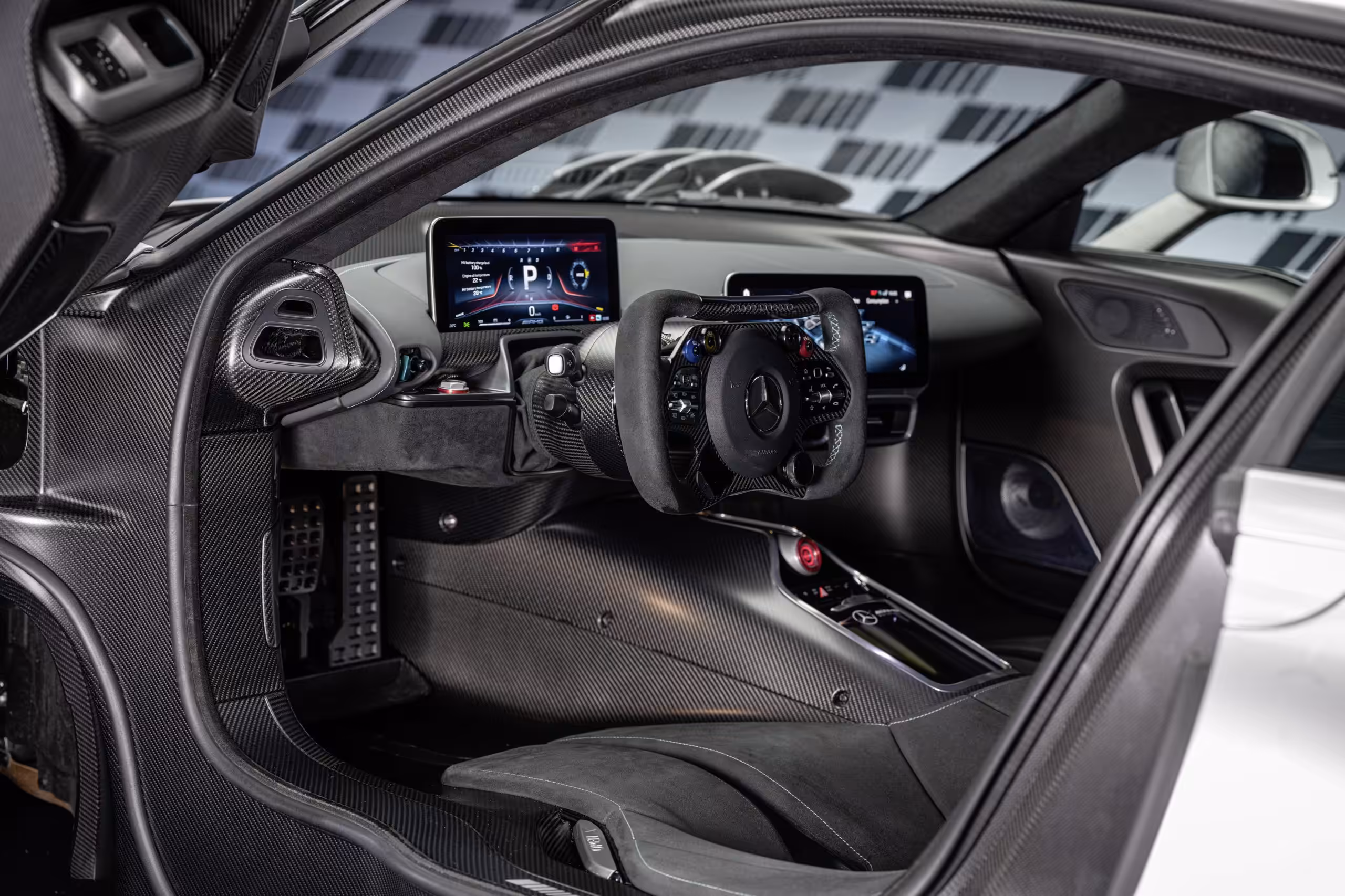 Výplne dverí sú z funkčných, vysokokvalitných uhlíkových vlákien a hladko sa integrujú do športového interiéru. Kazeta z masívneho kovu kombinuje vetracie otvory a spínače elektrického ovládania okien, ktoré sú integrované ako hlboko zapustené obdĺžniky. Ako sval ďaleko dopredu vybieha obrys dverí smerom dozadu a vytvára priestor pre charakteristický priebeh vonkajšej línie okien. Kontrolka radenia sa zobrazuje v hornej časti venca volantu, ako je to bežné v pretekárskych autách. Volant, ktorý je hore a dole sploštený a má integrovaný airbag, ponúka ďalšie prvky výbavy pre motoristický šport: pomocou dvoch integrovaných tlačidiel AMG na volante možno aktivovať rôzne funkcie bez toho, aby ste museli zložiť ruky z volantu. Napríklad jazdné programy, deväťstupňovú trakčnú kontrolu AMG, aktiváciu DRS alebo nastavenie pruženia.